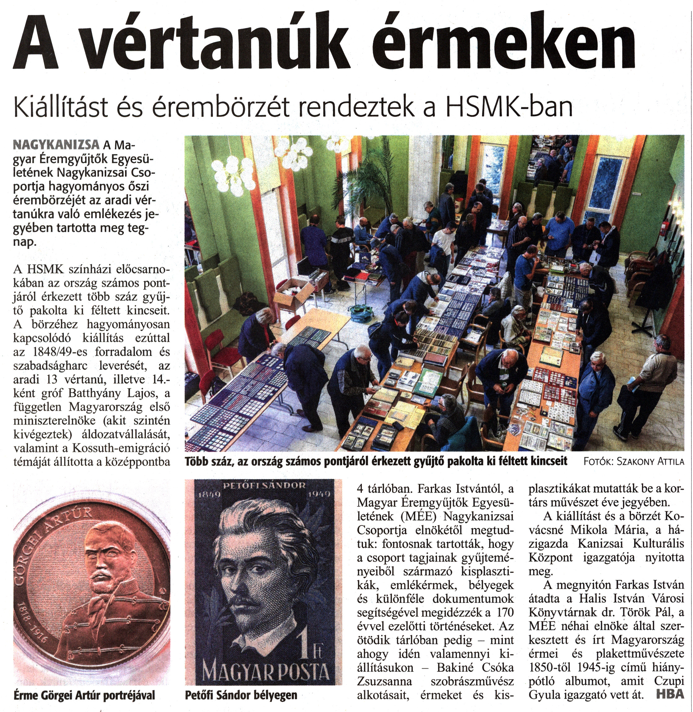 Nyilvános 1749 | 2422 | Zalai Hírlap 2019. november 4. 255. szám 3. oldal - A vértanúk érmeken | A vértanúk érmeken Kiállítást és érembörzét rendeztek a HSMK-ban NAGYKANIZSA A Magyar Éremgyűjtők Egyesületének Nagykanizsai Csoportja hagyományos őszi érembörzéjét az aradi vértanúkra való emlékezés jegyében tartotta meg tegnap. A HSMK színházi előcsarnokában az ország számos pontjáról érkezett több száz gyűjtő pakolta ki féltett kincseit. A börzéhez hagyományosan kapcsolódó kiállítás ezúttal az 1848/49-es forradalom és szabadságharc leverését, az aradi 13 vértanú, illetve 14.-ként gróf Batthyány Lajos, a független Magyarország első miniszterelnöke (akit szintén kivégeztek) áldozatvállalását, valamint a Kossuth-emigráció témáját állította a középpontba 4 tárlóban. Farkas Istvántól, a Magyar Éremgyüjtők Egyesületének (MÉE) Nagykanizsai Csoportja elnökétől megtudtuk: fontosnak tartották, hogy a csoport tagjainak gyűjteményeiből származó kisplasztikák, emlékérmek, bélyegek és különféle dokumentumok segítségével megidézzék a 170 évvel ezelőtti történéseket. Az ötödik tárlóban pedig - mint ahogy idén valamennyi kiállításukon - Bakiné Csóka Zsuzsanna szobrászművész alkotásait, érmeket és kisplasztikákat mutatták be a kortárs művészet éve jegyében. A kiállítást és a börzét Kovácsné Mikola Mária, a házigazda Kanizsai Kulturális Központ igazgatója nyitotta meg. A megnyitón Farkas István átadta a Halis István Városi Könyvtárnak dr. Török Pál, a MÉE néhai elnöke által szerkesztett és írt Magyarország érmei és plakettművészete 1850-től 1945-ig című hiánypótló albumot, amit Czupi Gyula igazgató vett át. HBA Érme Görgei Artúr portréjával Petőfi Sándor bélyegen Több száz, az ország számos pontjáról érkezett gyűjtő pakolta ki féltett kincseit Fotók: Szakony Attila |