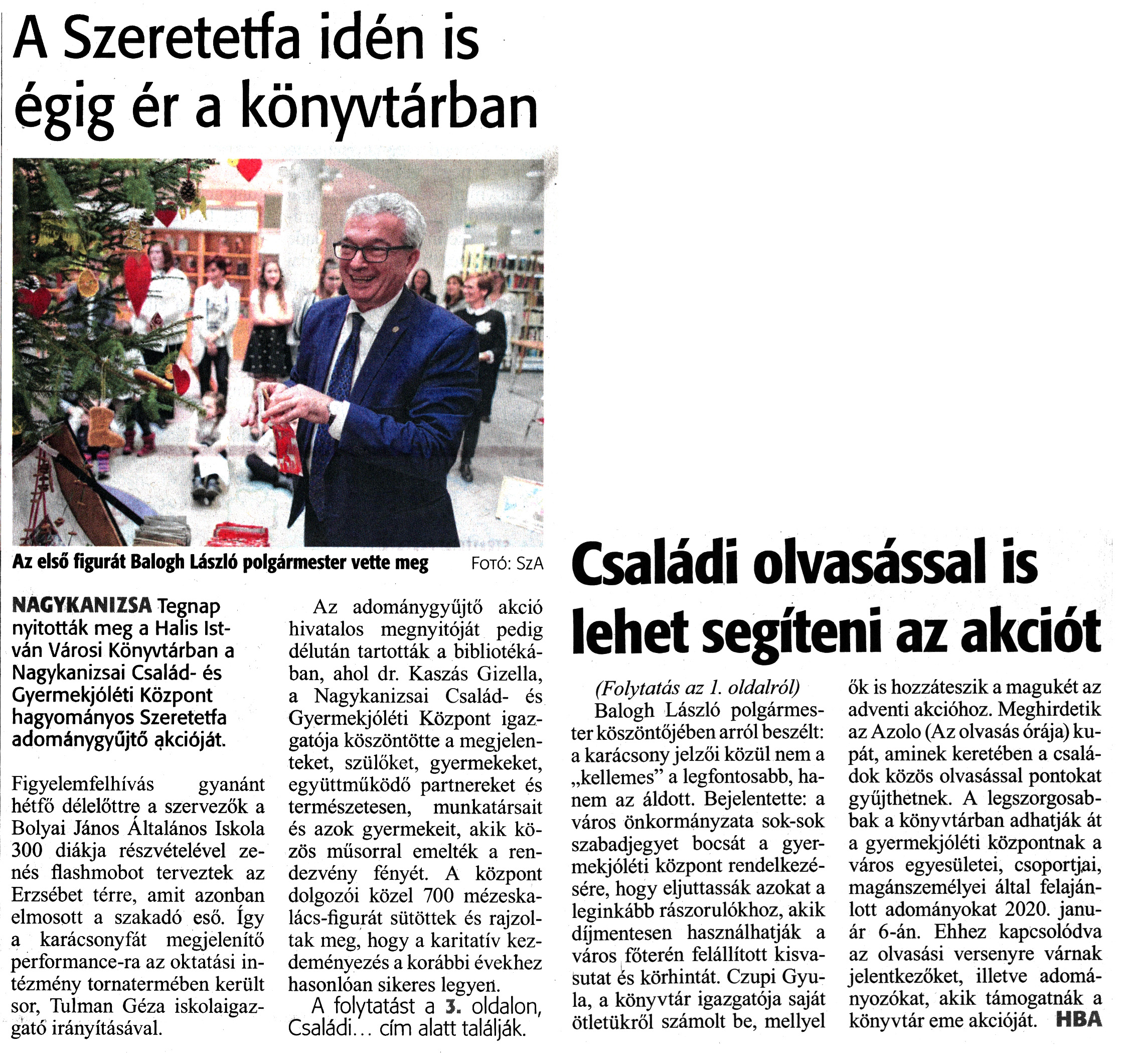 Nyilvános 1827 | 2782 | Zalai Hírlap 2019. december 3. 280. szám 1, 3. oldal | A Szeretetfa idén is égig ér a könyvtárban NAGYKANIZSA Tegnap nyitották meg a Halis István Városi Könyvtárban a Nagykanizsai Család- és Gyermekjóléti Központ hagyományos Szeretetfa adománygyűjtő akcióját. Figyelemfelhívás gyanánt hétfő délelőttre a szervezők a Bolyai János Általános Iskola 300 diákja részvételével zenés flashmobot terveztek az Erzsébet térre, amit azonban elmosott a szakadó eső. így a karácsonyfát megjelenítő performance-ra az oktatási intézmény tornatermében került sor, Tulman Géza iskolaigazgató irányításával. Az adománygyűjtő akció hivatalos megnyitóját pedig délután tartották a bibliotékában, ahol dr. Kaszás Gizella, a Nagykanizsai Család- és Gyermekjóléti Központ igazgatója köszöntötte a megjelenteket, szülőket, gyermekeket, együttműködő partnereket és természetesen, munkatársait és azok gyermekeit, akik közös műsorral emelték a rendezvény fényét. A központ dolgozói közel 700 mézeskalács-figurát sütöttek és rajzoltak meg, hogy a karitatív kezdeményezés a korábbi évekhez hasonlóan sikeres legyen. A folytatást a 3. oldalon, Családi... cím alatt találják. Családi olvasással is lehet segíteni az akciót Az első figurát Balogh László polgármester vette meg Fotó: SzA (Folytatás az 1. oldalról) Balogh László polgármester köszöntőjében arról beszélt: a karácsony jelzői közül nem a „kellemes" a legfontosabb, hanem az áldott. Bejelentette: a város önkormányzata sok-sok szabadjegyet bocsát a gyermekjóléti központ rendelkezésére, hogy eljuttassák azokat a leginkább rászorulókhoz, akik díjmentesen használhatják a város főterén felállított kisvasutat és körhintát. Czupi Gyula, a könyvtár igazgatója saját ötletükről számolt be, mellyel ők is hozzáteszik a magukét az adventi akcióhoz. Meghirdetik az Azolo (Az olvasás órája) kupát, aminek keretében a családok közös olvasással pontokat gyűjthetnek. A legszorgosabbak a könyvtárban adhatják át a gyermekjóléti központnak a város egyesületei, csoportjai, magánszemélyei által felajánlott adományokat 2020. január 6-án. Ehhez kapcsolódva az olvasási versenyre várnak jelentkezőket, illetve adományozókat, akik támogatnák a könyvtár eme akcióját. HBA |