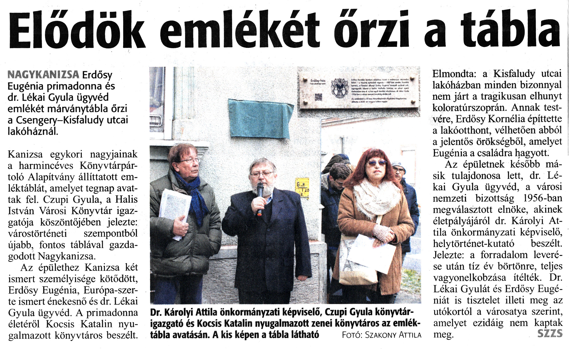Nyilvános 1801 | 2880 | Zalai Hírlap 2020. január 23. 19. szám 3. oldal | Elődök emlékét őrzi a tábla NAGYKANIZSA Erdősy Eugénia primadonna és dr. Lékai Gyula ügyvéd emlékét márványtábla őrzi a Csengery-Kisfaludy utcai lakóháznál. Kanizsa egykori nagyjainak a harmincéves Könyvtárpártoló Alapítvány állíttatott emléktáblát, amelyet tegnap avattak fel. Czupi Gyula, a Halis István Városi Könyvtár igazgatója köszöntőjében jelezte: várostörténeti szempontból újabb, fontos táblával gazdagodott Nagykanizsa. Az épülethez Kanizsa két ismert személyisége kötődött, Erdősy Eugénia, Európa-szerte ismert énekesnő és dr. Lékai Gyula ügyvéd. A primadonna életéről Kocsis Katalin nyugalmazott könyvtáros beszélt. Elmondta: a Kisfaludy utcai lakóházban minden bizonnyal nem járt a tragikusan elhunyt koloratúrszoprán. Annak testvére, Erdősy Kornélia építtette a lakóotthont, vélhetően abból a jelentős örökségből, amelyet Eugénia a családra hagyott. Az épületnek később másik tulajdonosa lett, dr. Lékai Gyula ügyvéd, a városi nemzeti bizottság 1956-ban megválasztott elnöke, akinek életpályájáról dr. Károlyi Attila önkormányzati képviselő, helytörténet-kutató beszélt. Jelezte: a forradalom leverése után tíz év börtönre, teljes vagyonelkobzása ítélték. Dr. Lékai Gyulát és Erdősy Eugéniát is tisztelet illeti meg az utókortól a városatya szerint, amelyet ezidáig nem kaptak meg. SZZS Dr. Károlyi Attila önkormányzati képviselő, Czupi Gyula könyvtárigazgató és Kocsis Katalin nyugalmazott zenei könyvtáros az emléktábla avatásán. A kis képen a tábla látható Fotó: Szakony Attila |