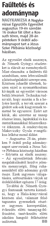 Nyilvános 1709 | 2538 | Zalai Hírlap 2020. augusztus 13. 189. szám 6. oldal | Faültetés és adománynap NAGYKANIZSA A Nagykanizsai Egyszülős Egyesület augusztus 19-én szerdán 16 órakor fát ültet a Kossuth téren, majd 28-án pénteken 9 órától adománynapot tart a Jézus Szíve Plébánia közösségi házában. Az egyesület elnök asszonya, dr. Németh Györgyi részleteket is elárult az eseményekről. Mint elmondta: a faültetés élő szimbólum, nem lebecsülendő a közösségalakító szerepe sem. Közösen juharfát ültetnek, hiszen ezzel is nyomatékosítani kívánják az egyesület városon belüli létezését. Technikai tudnivaló, hogy miután a fa a helyére került, a tervek szerint a gödröt sok-sok kisgyermek temetné be egyszerre. Ezért azt kérik, aki szeretne az ünnep részese lenni, lapátokkal és kis öntözőkannákkal felszerelkezve érkezzen. A rendezvényen Makoviczky Gyula evangélikus lelkész mond áldást. – Augusztus 28-án, pénteken 9 órától pedig adománynapot szervezünk a Jézus Szíve Plébánia közösségi házában – folytatta az elnök asszony. – Az egyesületünk februári megalakulásától kezdve jelentős mennyiségű, főleg ruhaneműkből álló adomány gyűlt össze. Ezek ingyenes válogatására, szétosztására várjuk az érdeklődőket egészen 17 óráig. Továbbá dr. Németh Györgyi fontosnak tartotta kiemelni, hogy a Halis-könyvtárral közösen alsó, valamint felső tagozatos gyermekek részére ingyenes korrepetálást, frissítést, tanévkezdés előtti iskolára hangoló felkészítést indítottak. BB |