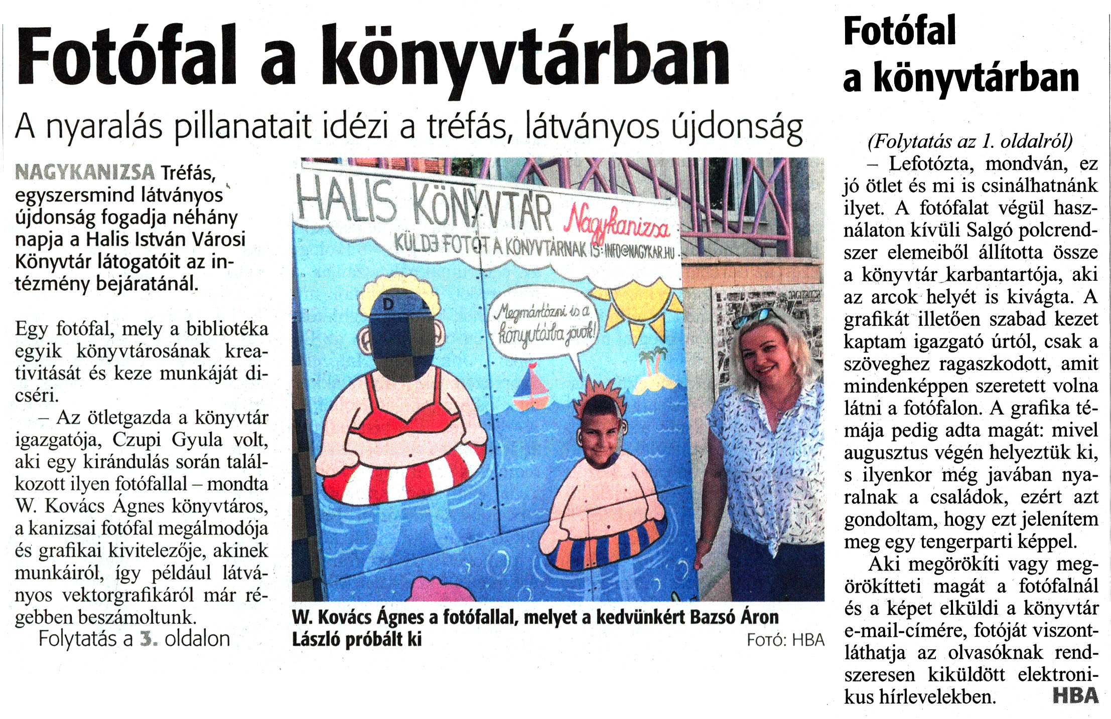 Nyilvános 1278 | 1943 | Zalai Hírlap 2020. szeptember 7. 209. szám 1,3. oldal | Fotófal a könyvtárban A nyaralás pillanatait idézi a tréfás, látványos újdonság NAGYKANIZSA Tréfás, egyszersmind látványos újdonság fogadja néhány napja a Halis István Városi Könyvtár látogatóit az intézmény bejáratánál. Egy fotófal, mely a bibliotéka egyik könyvtárosának kreativitását és keze munkáját dicséri. - Az ötletgazda a könyvtár igazgatója, Czupi Gyula volt, aki egy kirándulás során találkozott ilyen fotófallal - mondta W. Kovács Ágnes könyvtáros, a kanizsai fotófal megálmodója és grafikai kivitelezője, akinek munkáiról, így például látványos vektorgrafikáról már régebben beszámoltunk. - Lefotózta, mondván, ez jó ötlet és mi is csinálhatnánk ilyet. A fotófalat végül használaton kívüli Salgó polcrendszer elemeiből állította össze a könyvtár karbantartója, aki az arcok helyét is kivágta. A grafikát illetően szabad kezet kaptam igazgató úrtól, csak a szöveghez ragaszkodott, amit mindenképpen szeretett volna látni a fotófalon. A grafika témája pedig adta magát: mivel augusztus végén helyeztük ki, s ilyenkor még javában nyaralnak a családok, ezért azt gondoltam, hogy ezt jelenítem meg egy tengerparti képpel. Aki megörökíti vagy megörökítteti magát a fotófalnál és a képet elküldi a könyvtár e-mail-címére, fotóját viszontláthatja az olvasóknak rendszeresen kiküldött elektronikus hírlevelekben. HBA W. Kovács Ágnes a fotófallal, melyet a kedvünkért Bazsó Aron László próbált ki Fotó: HBA |