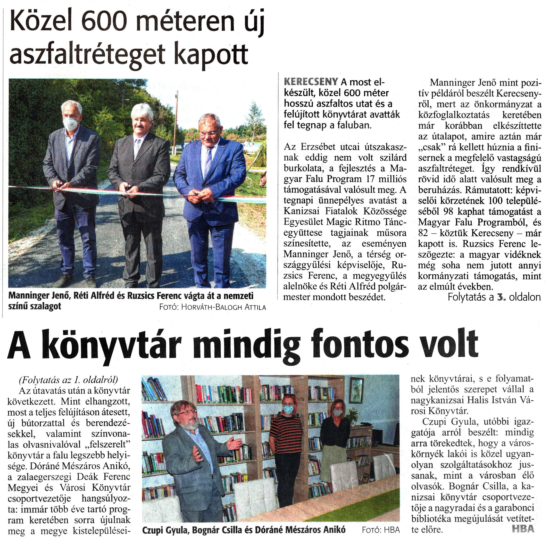 Nyilvános 1746 | 2269 | Zalai Hírlap 2020. szeptember 19. 220. szám 1, 3. oldal | Közel 600 méteren új aszfaltréteget kapott KERECSENY A most elkészült, közel 600 méter hosszú aszfaltos utat és a felújított könyvtárat avatták fel tegnap a faluban. Az Erzsébet utcai útszakasznak eddig nem volt szilárd burkolata, a fejlesztés a Magyar Falu Program 17 milliós támogatásával valósult meg. A tegnapi ünnepélyes avatást a Kanizsai Fiatalok Közössége Egyesület Magic Ritmo Táncegyüttese tagjainak műsora színesítette, az eseményen Manninger Jenő, a térség országgyűlési képviselője, Ruzsics Ferenc, a megyegyülés alelnöke és Réti Alfréd polgármester mondott beszédet. Manninger Jenő mint pozitív példáról beszélt Kerecsenyről, mert az önkormányzat a közfoglalkoztatás keretében már korábban elkészíttette az útalapot, amire aztán már „csak" rá kellett húznia a finisernek a megfelelő vastagságú aszfaltréteget. így rendkívül rövid idő alatt valósult meg a beruházás. Rámutatott: képviselői körzetének 100 településéből 98 kaphat támogatást a Magyar Falu Programból, és 82 - köztük Kerecseny - már kapott is. Ruzsics Ferenc leszögezte: a magyar vidéknek még soha nem jutott annyi kormányzati támogatás, mint az elmúlt években. Folytatás a 3. oldalon A könyvtár mindig fontos volt (Folytatás az 1. oldalról) Az útavatás után a könyvtár következett. Mint elhangzott, most a teljes felújításon átesett, új bútorzattal és berendezésekkel, valamint színvonalas olvasnivalóval „felszerelt" könyvtár a falu legszebb helyisége. Dóráné Mészáros Anikó, a zalaegerszegi Deák Ferenc Megyei és Városi Könyvtár csoportvezetője hangsúlyozta: immár több éve tartó program keretében sorra újulnak meg a megye kistelepüléseinek könyvtárai, s e folyamatból jelentős szerepet vállal a nagykanizsai Halis István Városi Könyvtár. Czupi Gyula, utóbbi igazgatója arról beszélt: mindig arra törekedtek, hogy a városkörnyék lakói is közel ugyanolyan szolgáltatásokhoz jussanak, mint a városban élő olvasók. Bognár Csilla, a kanizsai könyvtár csoportvezetője a nagyradai és a garabonci bibliotéka megújulását vetítette előre. HBA Manninger Jenő, Réti Alfréd és Ruzsics Ferenc vágta át a nemzeti színű szalagot Fotó: Horváth-Balogh Attila Czupi Gyula, Bognár Csilla és Dóráné Mészáros Anikó Fotó: HBA |
