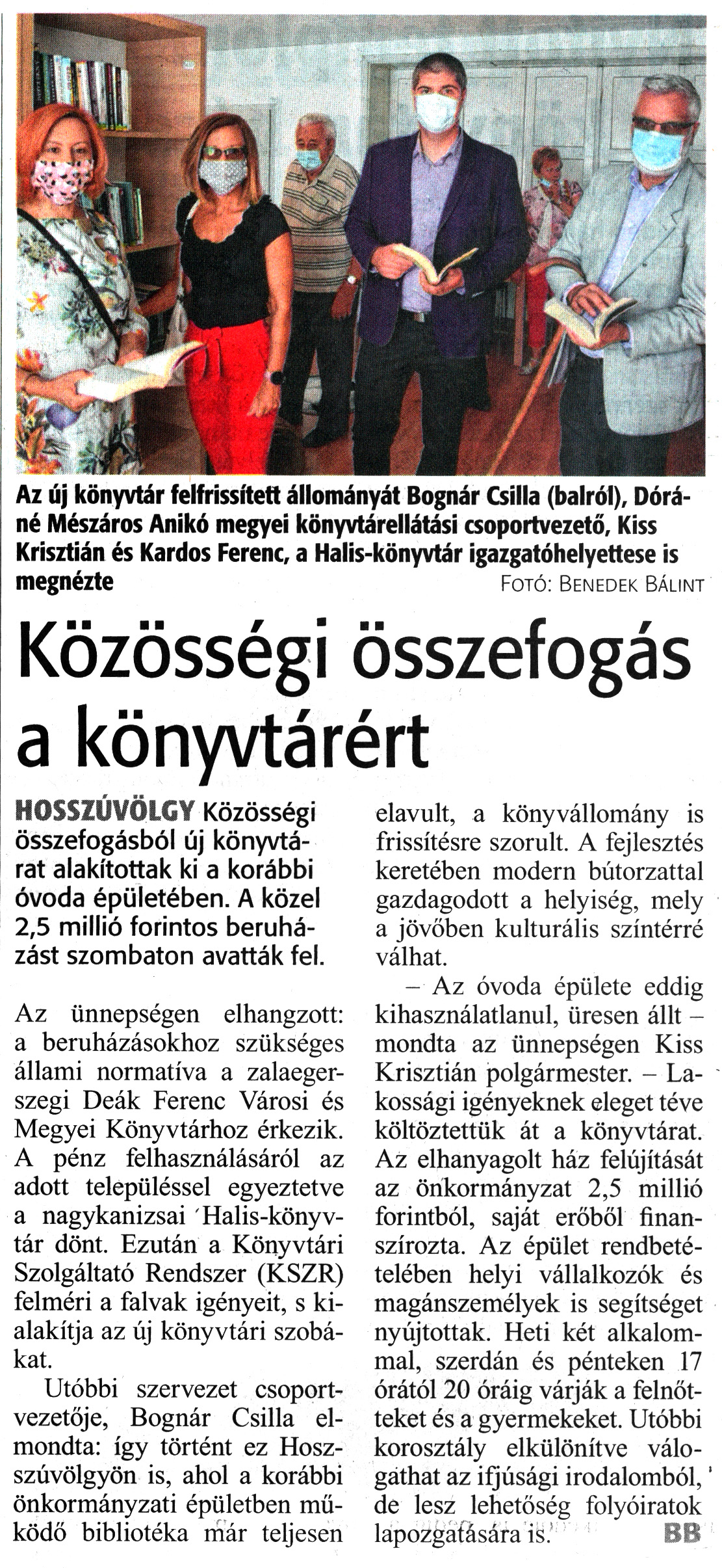 Nyilvános 1610 | 2162 | Zalai Hírlap 2020. szeptember 21. 221. szám 6. oldal | Közösségi összefogás a könyvtárért HOSSZÚVÖLGY Közösségi összefogásból új könyvtárat alakítottak ki a korábbi óvoda épületében. A közel 2,5 millió forintos beruházást szombaton avatták fel. Az ünnepségen elhangzott: a beruházásokhoz szükséges állami normatíva a zalaegerszegi Deák Ferenc Városi és Megyei Könyvtárhoz érkezik. A pénz felhasználásáról az adott településsel egyeztetve a nagykanizsai Halis-könyvtár dönt. Ezután a Könyvtári Szolgáltató Rendszer (KSZR) felméri a falvak igényeit, s kialakítja az új könyvtári szobákat. Utóbbi szervezet csoportvezetője, Bognár Csilla elmondta: így történt ez Hosszúvölgyön is, ahol a korábbi önkormányzati épületben működő bibliotéka már teljesen elavult, a könyvállomány is frissítésre szorult. A fejlesztés keretében modern bútorzattal gazdagodott a helyiség, mely a jövőben kulturális színtérré válhat. - Az óvoda épülete eddig kihasználatlanul, üresen állt -mondta az ünnepségen Kiss Krisztián polgármester. - Lakossági igényeknek eleget téve költöztettük át a könyvtárat. Az elhanyagolt ház felújítását az önkormányzat 2,5 millió forintból, saját erőből finanszírozta. Az épület rendbetételében helyi vállalkozók és magánszemélyek is segítséget nyújtottak. Heti két alkalommal, szerdán és pénteken 17 órától 20 óráig várják a felnőtteket és a gyermekeket. Utóbbi korosztály elkülönítve válogathat az ifjúsági irodalomból, de lesz lehetőség folyóiratok lapozgatására is. BB Az új könyvtár felfrissített állományát Bognár Csilla (balról), Dóráné Mészáros Anikó megyei könyvtárellátási csoportvezető, Kiss Krisztián és Kardos Ferenc, a Halis-könyvtár igazgatóhelyettese is megnézte Fotó: Benedek Bálint |