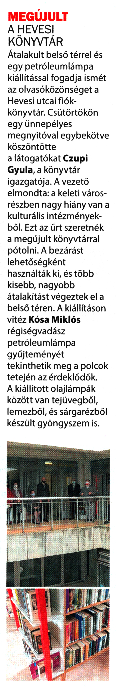 Nyilvános 1640 | 2217 | Kanizsa 2021. május 21. 8. szám 3. oldal | MEGÚJULT A HEVESI KÖNYVTÁR Átalakult belső térrel és egy petróleumlámpa kiállítással fogadja ismét az olvasóközönséget a Hevesi utcai fiókkönyvtár. Csütörtökön egy ünnepélyes megnyitóval egybekötve köszöntötte a látogatókat Czupi Gyula, a könyvtár igazgatója. A vezető elmondta: a keleti városrészben nagy hiány van a kulturális intézményekből. Ezt az űrt szeretnék a megújult könyvtárral pótolni. A bezárást lehetőségként használták ki, és több kisebb, nagyobb átalakítást végeztek el a belső téren. A kiállításon vitéz Kósa Miklós régiségvadász petróleumlámpa gyűjteményét tekinthetik meg a polcok tetején az érdeklődők. A kiállított olajlámpák között van tejüvegből, lemezből, és sárgarézből készült gyöngyszem is. |