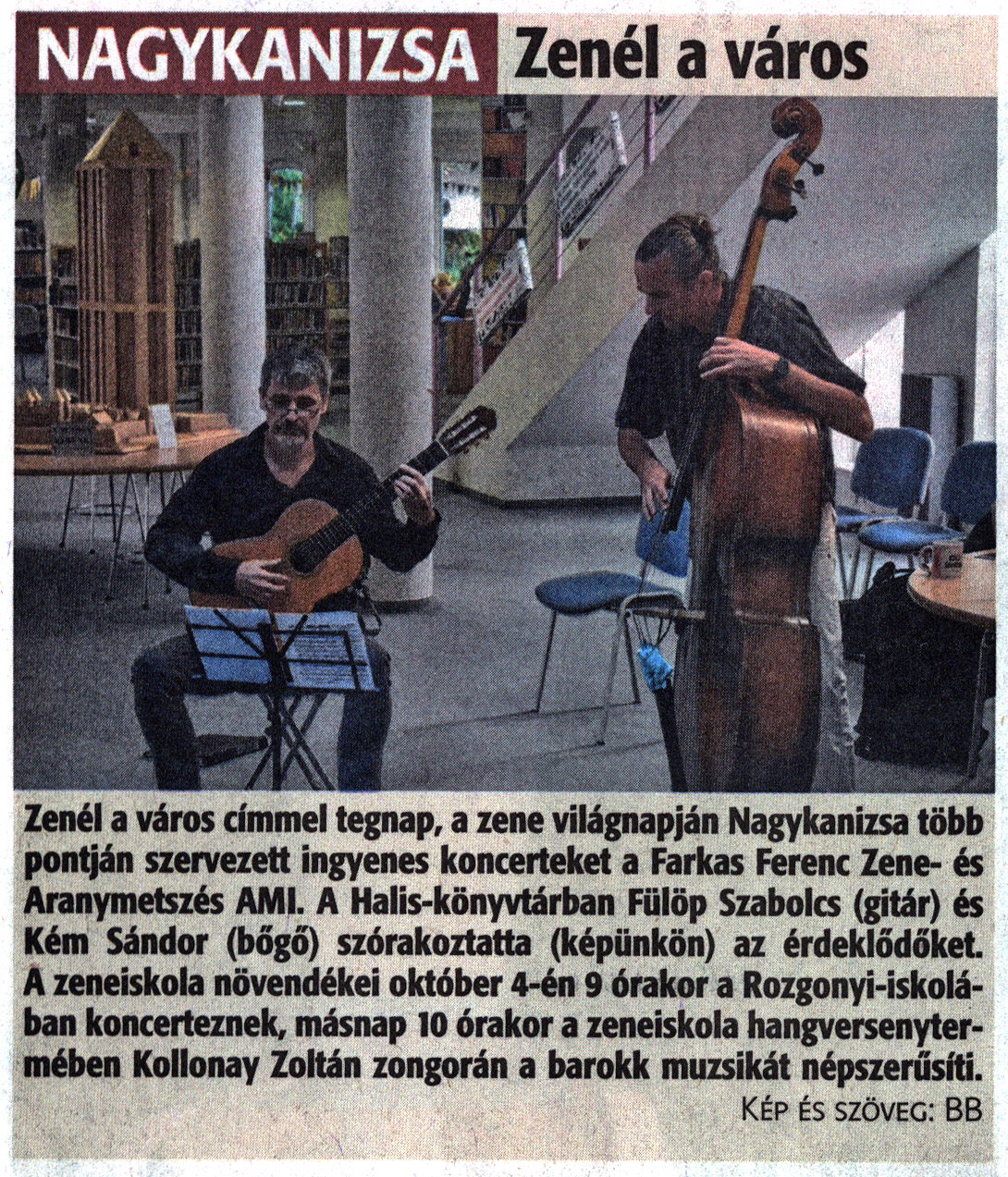 Nyilvános 1658 | 2230 | Zalai Hírlap 2021. október 2. 229. szám 16. oldal | Nagykanizsa - Zenél a város Zenél a város címmel tegnap, a zene világnapján Nagykanizsa több pontján szervezett ingyenes koncerteket a Farkas Ferenc Zene- és Aranymetszés AMI. A Halis-könyvtárban Fülöp Szabolcs (gitár) és Kém Sándor (bőgő) szórakoztatta (képünkön) az érdeklődőket. A zeneiskola növendékei október 4-én 9 órakor a Rozgonyi-iskolában koncerteznek, másnap 10 órakor a zeneiskola hangversenytermében Kollonay Zoltán zongorán a barokk muzsikát népszerűsíti. Kép és szöveg: BB |