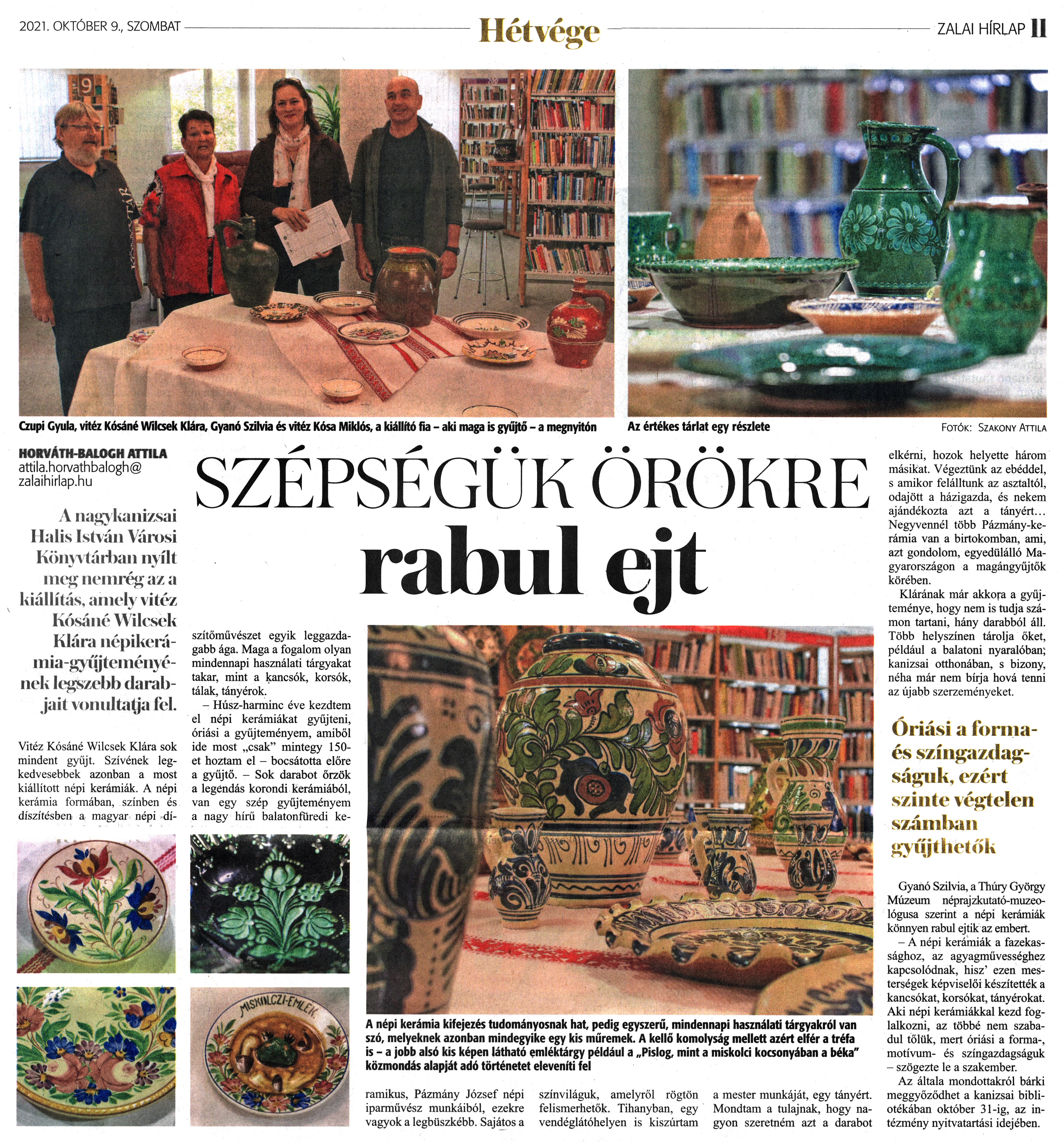 Nyilvános 1569 | 2252 | Zalai Hírlap 2021. október 9. 235. szám 11. oldal | SZÉPSÉGÜK ÖRÖKRE rabul ejt HORVÁTH-BALOGH ATTILA attila.horvathbalogh@zalaihirlap.hu A nagykanizsai Halis István Városi Könyvtárban nyílt meg nemrég az a kiállítás, amely vitéz Kósáné Wilcsek Klára népikerámia-gyűjteményének legszebb darabjait vonultatja lel. Vitéz Kósáné Wilcsek Klára sok mindent gyűjt. Szívének legkedvesebbek azonban a most kiállított népi kerámiák. A népi kerámia formában, színben és díszítésben a magyar népi díszítőművészet egyik leggazdagabb ága. Maga a fogalom olyan mindennapi használati tárgyakat takar, mint a kancsók, korsók, tálak, tányérok. - Húsz-harminc éve kezdtem el népi kerámiákat gyűjteni, óriási a gyűjteményem, amiből ide most „csak" mintegy 150-et hoztam el - bocsátotta előre a gyűjtő. - Sok darabot őrzök a legéndás korondi kerámiából, van egy szép gyűjteményem a nagy hírű balatonfüredi keramikus, Pázmány József népi iparművész munkáiból, ezekre vagyok a legbüszkébb. Sajátos a színviláguk, amelyről rögtön felismerhetők. Tihanyban, egy vendéglátóhelyen is kiszúrtam a mester munkáját, egy tányért. Mondtam a tulajnak, hogy nagyon szeretném azt a darabot elkérni, hozok helyette három másikat. Végeztünk az ebéddel, s amikor felálltunk az asztaltól, odajött a házigazda, és nekem ajándékozta azt a tányért... Negyvennél több Pázmány-kerámia van a birtokomban, ami, azt gondolom, egyedülálló Magyarországon a magángyűjtők körében. Klárának már akkora a gyűjteménye, hogy nem is tudja számon tartani, hány darabból áll. Több helyszínen tárolja őket, például a balatoni nyaralóban; kanizsai otthonában, s bizony, néha már nem bírja hová tenni az újabb szerzeményeket. Gyanó Szilvia, a Thúry György Múzeum néprajzkutató-muzeológusa szerint a népi kerámiák könnyen rabul ejtik az embert. - A népi kerámiák a fazekassághoz, az agyagművességhez kapcsolódnak, hisz'' ezen mesterségek képviselői készítették a kancsókat, korsókat, tányérokat. Aki népi kerámiákkal kezd foglalkozni, az többé nem szabadul tőlük, mert óriási a forma-, motívum- és színgazdagságuk - szögezte le a szakember. Az általa mondottakról bárki meggyőződhet a kanizsai bibliotékában október 31-ig, az intézmény nyitvatartási idejében. A népi kerámia kifejezés tudományosnak hat, pedig egyszerű, mindennapi használati tárgyakról van szó, melyeknek azonban mindegyike egy kis műremek. A kellő komolyság mellett azért elfér a tréfa is - a jobb alsó kis képen látható emléktárgy például a „Pislog, mint a miskolci kocsonyában a béka" közmondás alapját adó történetet eleveníti fel Az értékes tárlat egy részlete Czupi Gyula, vitéz Kósáné Wilcsek Klára, Gyanó Szilvia és vitéz Kósa Miklós, a kiállító fia - aki maga is gyűjtő - a megnyitón Fotók: Szakony Attila |