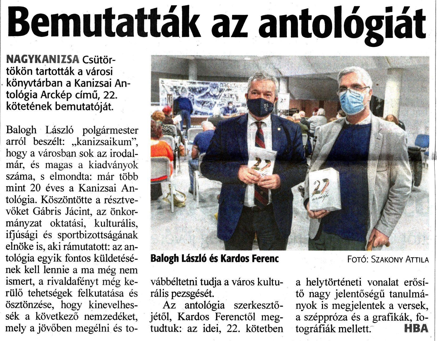 Nyilvános 1514 | 2052 | Zalai Hírlap 2021. december 11. 287. szám 16. oldal | Bemutatták az antológiát NAGYKANIZSA Csütörtökön tartották a városi könyvtárban a Kanizsai Antológia Arckép című, 22. kötetének bemutatóját. Balogh László polgármester arról beszélt: „kanizsaikum", hogy a városban sok az irodalmár, és magas a kiadványok száma, s elmondta: már több mint 20 éves a Kanizsai Antológia. Köszöntötte a résztvevőket Gábris Jácint, az önkormányzat oktatási, kulturális, ifjúsági és sportbizottságának elnöke is, aki rámutatott: az antológia egyik fontos küldetésének kell lennie a ma még nem ismert, a rivaldafényt még kerülő tehetségek felkutatása és ösztönzése, hogy kinevelhessék a következő nemzedéket, mely a jövőben megélni és továbbéltetni tudja a város kulturális pezsgését. Az antológia szerkesztőjétől, Kardos Ferenctől megtudtuk: az idei, 22. kötetben a helytörténeti vonalat erősítő nagy jelentőségű tanulmányok is megjelentek a versek, a széppróza és a grafikák, fotográfiák mellett. HBA Balogh László és Kardos Ferenc Fotó: Szakony Attila |