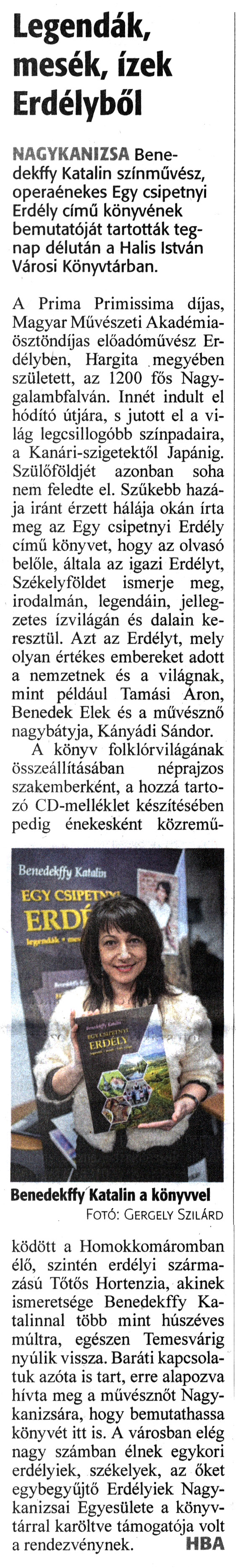 Nyilvános 1550 | 1917 | Zalai Hírlap 2021. december 13. 288. szám 2. oldal | Legendák, mesék, ízek Erdélyből NAGYKANIZSA Benedekffy Katalin színművész, operaénekes Egy csipetnyi Erdély című könyvének bemutatóját tartották tegnap délután a Halis István Városi Könyvtárban. A Prima Primissima díjas, Magyar Művészeti Akadémiaösztöndíjas előadóművész Erdélyben, Hargita megyében született, az 1200 fős Nagygalambfalván. Innét indult el hódító útjára, s jutott el a világ legcsillogóbb színpadaira, a Kanári-szigetektől Japánig. Szülőföldjét azonban soha nem feledte el. Szűkebb hazája iránt érzett hálája okán írta meg az Egy csipetnyi Erdély című könyvet, hogy az olvasó belőle, általa az igazi Erdélyt, Székelyföldet ismerje meg, irodalmán, legendáin, jellegzetes ízvilágán és dalain keresztül. Azt az Erdélyt, mely olyan értékes embereket adott a nemzetnek és a világnak, mint például Tamási Áron, Benedek Elek és a művésznő nagybátyja, Kányádi Sándor. A könyv folklórvilágának összeállításában néprajzos szakemberként, a hozzá tartozó CD-melléklet készítésében pedig énekesként közreműködött a Homokkomáromban élő, szintén erdélyi származású Tőtős Hortenzia, akinek ismeretsége Benedekffy Katalinnal több mint húszéves múltra, egészen Temesvárig nyúlik vissza. Baráti kapcsolatuk azóta is tart, erre alapozva hívta meg a művésznőt Nagykanizsára, hogy bemutathassa könyvét itt is. A városban elég nagy számban élnek egykori erdélyiek, székelyek, az őket egybegyűjtő Erdélyiek Nagykanizsai Egyesülete a könyvtárral karöltve támogatója volt a rendezvénynek. HBA Benedekffy Katalin a könyvvel Fotó: Gergely Szilárd |
