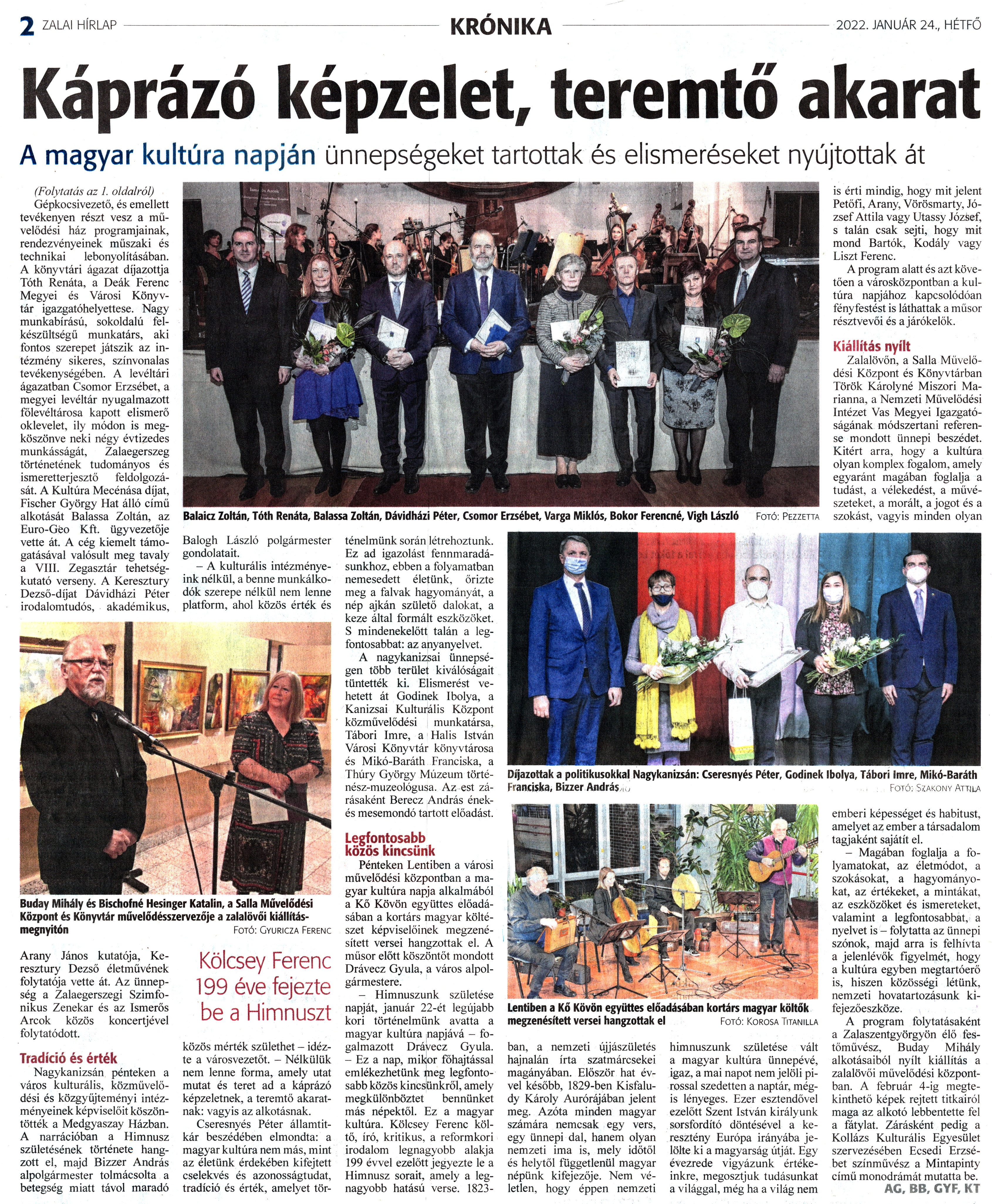 Nyilvános 1529 | 2451 | Zalai Hírlap 2022. január 24. 19. szám 2. oldal | Káprázó képzelet, teremtő akarat A magyar kultúra napján ünnepségeket tartottak és elismeréseket nyújtottak át (Folytatás az 1. oldalról) Gépkocsivezető, és emellett tevékenyen részt vesz a művelődési ház programjainak, rendezvényeinek műszaki és technikai lebonyolításában. A könyvtári ágazat díjazottja Tóth Renáta, a Deák Ferenc Megyei és Városi Könyvtár igazgatóhelyettese. Nagy munkabírású, sokoldalú felkészültségű munkatárs, aki fontos szerepet játszik az intézmény sikeres, színvonalas tevékenységében. A levéltári ágazatban Csomor Erzsébet, a megyei levéltár nyugalmazott főlevéltárosa kapott elismerő oklevelet, ily módon is megköszönve neki négy évtizedes munkásságát, Zalaegerszeg történetének tudományos és ismeretterjesztő feldolgozását. A Kultúra Mecénása díjat, Fischer György Hat álló című alkotását Balassa Zoltán, az Euro-Géo Kft. ügyvezetője vette át. A cég kiemelt támogatásával valósult meg tavaly a VIII. Zegasztár tehetségkutató verseny. A Keresztury Dezső-díjat Dávidházi Péter irodalomtudós, akadémikus. Arany János kutatója, Keresztury Dezső életművének folytatója vette át. Az ünnepség a Zalaegerszegi Szimfonikus Zenekar és az Ismerős Arcok közös koncertjével folytatódott. Tradíció és érték Nagykanizsán pénteken a város kulturális, közművelődési és közgyűjteményi intézményeinek képviselőit köszöntötték a Medgyaszay Házban. A narrációban a Himnusz születésének története hangzott el, majd Bizzer András alpolgármester tolmácsolta a betegség miatt távol maradó Balogh László polgármester gondolatait. - A kulturális intézményeink nélkül, a benne munkálkodók szerepe nélkül nem lenne platform, ahol közös érték és közös mérték születhet - idézte a városvezetőt. - Nélkülük nem lenne forma, amely utat mutat és teret ad a káprázó képzeletnek, a teremtő akaratnak: vagyis az alkotásnak. Cseresnyés Péter államtitkár beszédében elmondta: a magyar kultúra nem más, mint az életünk érdekében kifejtett cselekvés és azonosságtudat, tradíció és érték, amelyet történelmünk során létrehoztunk. Ez ad igazolást fennmaradásunkhoz, ebben a folyamatban nemesedett életünk, őrizte meg a falvak hagyományát, a nép ajkán születő dalokat, a keze által formált eszközöket. S mindenekelőtt talán a legfontosabbat: az anyanyelvet. A nagykanizsai ünnepségen több terület kiválóságait tüntették ki. Elismerést vehetett át Gödinek Ibolya, a Kanizsai Kulturális Központ közművelődési munkatársa, Tábori Imre, a Halis István Városi Könyvtár könyvtárosa és Mikó-Baráth Franciska, a Thúry György Múzeum történész-muzeológusa. Az est zárásaként Berecz András ének-és mesemondó tartott előadást. Legfontosabb közös kincsünk Pénteken Lentiben a városi művelődési központban a magyar kultúra napja alkalmából a Kő Kövön együttes előadásában a kortárs magyar költészet képviselőinek megzenésített versei hangzottak el. A műsor előtt köszöntőt mondott Drávecz Gyula, a város alpolgármestere. - Himnuszunk születése napját, január 22-ét legújabb kori történelmünk avatta a magyar kultúra napjává - fogalmazott Drávecz Gyula. - Ez a nap, mikor főhajtással emlékezhetünk meg legfontosabb közös kincsünkről, amely megkülönböztet bennünket más népektől. Ez a magyar kultúra. Kölcsey Ferenc költő, író, kritikus, a reformkori irodalom legnagyobb alakja 199 évvel ezelőtt jegyezte le a Himnusz sorait, amely a legnagyobb hatású verse. 1823-ban, a nemzeti újjászületés hajnalán írta szatmárcsekei magányában. Először hat évvel később, 1829-ben Kisfaludy Károly Aurórájában jelent meg. Azóta minden magyar számára nemcsak egy vers, egy ünnepi dal, hanem olyan nemzeti ima is, mely időtől és helytől függetlenül magyar népünk kifejezője. Nem véletlen, hogy éppen nemzeti himnuszunk születése vált a magyar kultúra ünnepévé, igaz, a mai napot nem jelöli pirossal szedetten a naptár, mégis lényeges. Ezer esztendővel ezelőtt Szent István királyunk sorsfordító döntésével a keresztény Európa irányába jelölte ki a magyarság útját. Egy évezrede vigyázunk értékeinkre, megosztjuk tudásunkat a világgal, még ha a világ nem is érti mindig, hogy mit jelent Petőfi, Arany, Vörösmarty, József Attila vagy Utassy József, s talán csak sejti, hogy mit mond Bartók, Kodály vagy Liszt Ferenc. A program alatt és azt követően a városközpontban a kultúra napjához kapcsolódóan fényfestést is láthattak a műsor résztvevői és a járókelők. Kiállítás nyílt Zalalövőn, a Salla Művelődési Központ és Könyvtárban Török Károly né Mi szőri Marianna, a Nemzeti Művelődési Intézet Vas Megyei Igazgatóságának módszertani referense mondott ünnepi beszédet. Kitért arra, hogy a kultúra olyan komplex fogalom, amely egyaránt magában foglalja a tudást, a vélekedést, a művészeteket, a morált, a jogot és a szokást, vagyis minden olyan emberi képességet és habitust, amelyet az ember a társadalom tagjaként sajátít el. - Magában foglalja a folyamatokat, az életmódot, a szokásokat, a hagyományokat, az értékeket, a mintákat, az eszközöket és ismereteket, valamint a legfontosabbat, a nyelvet is - folytatta az ünnepi szónok, majd arra is felhívta a jelenlévők figyelmét, hogy a kultúra egyben megtartóerő is, hiszen közösségi létünk, nemzeti hovatartozásunk kifejezőeszköze. A program folytatásaként a Zalaszentgyörgyön élő festőművész, Buday Mihály alkotásaiból nyílt kiállítás a zalalövői művelődési központban. A február 4-ig megtekinthető képek rejtett titkairól maga az alkotó lebbentette fel a fáty