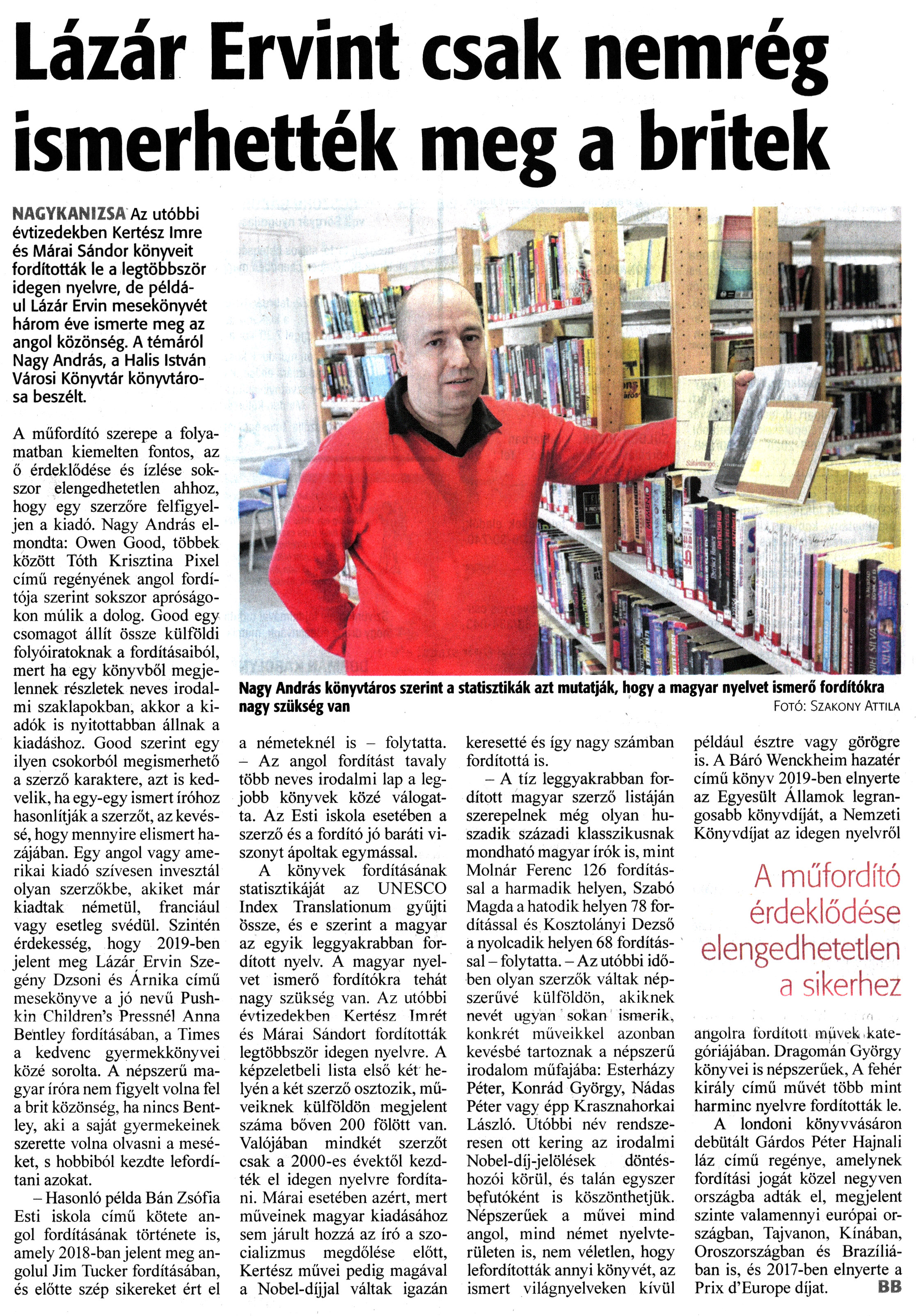 Nyilvános 1544 | 1991 | Zalai Hírlap 2022. február 9. 33. szám 12. oldal | Lázár Ervint csak nemrég ismerhették meg a britek NAGYKANIZSA Az utóbbi évtizedekben Kertész Imre és Márai Sándor könyveit fordították le a legtöbbször idegen nyelvre, de például Lázár Ervin mesekönyvét három éve ismerte meg az angol közönség. A témáról Nagy András, a Halis István Városi Könyvtár könyvtárosa beszélt. A műfordító szerepe a folyamatban kiemelten fontos, az ő érdeklődése és ízlése sokszor elengedhetetlen ahhoz, hogy egy szerzőre felfigyeljen a kiadó. Nagy András elmondta: Owen Good, többek között Tóth Krisztina Pixel című regényének angol fordítója szerint sokszor apróságokon múlik a dolog. Good egy csomagot állít össze külföldi folyóiratoknak a fordításaiból, mert ha egy könyvből megjelennek részletek neves irodalmi szaklapokban, akkor a kiadók is nyitottabban állnak a kiadáshoz. Good szerint egy ilyen csokorból megismerhető a szerző karaktere, azt is kedvelik, ha egy-egy ismert íróhoz hasonlítják a szerzőt, az kevéssé, hogy mennyire elismert hazájában. Egy angol vagy amerikai kiadó szívesen invesztál olyan szerzőkbe, akiket már kiadtak németül, franciául vagy esetleg svédül. Szintén érdekesség, hogy 2019-ben jelent meg Lázár Ervin Szegény Dzsoni és Árnika című mesekönyve a jó nevű Push-kin Children''s Pressnél Anna Bentley fordításában, a Times a kedvenc gyermekkönyvei közé sorolta. A népszerű magyar íróra nem figyelt volna fel a brit közönség, ha nincs Bentley, aki a saját gyermekeinek szerette volna olvasni a meséket, s hobbiból kezdte lefordítani azokat. - Hasonló példa Bán Zsófia Esti iskola című kötete angol fordításának története is, amely 2018-ban jelent meg angolul Jim Tucker fordításában, és előtte szép sikereket ért el a németeknél is - folytatta. - Az angol fordítást tavaly több neves irodalmi lap a legjobb könyvek közé válogatta. Az Esti iskola esetében a szerző és a fordító jó baráti viszonyt ápoltak egymással. A könyvek fordításának statisztikáját az UNESCO Index Translationum gyűjti Össze, és e szerint a magyar az egyik leggyakrabban fordított nyelv. A magyar nyelvet ismerő fordítókra tehát nagy szükség van. Az utóbbi évtizedekben Kertész Imrét és Márai Sándort fordították legtöbbször idegen nyelvre. A képzeletbeli lista első két helyén a két szerző osztozik, műveiknek külföldön megjelent száma bőven 200 fölött van. Valójában mindkét szerzőt csak a 2000-es évektől kezdték el idegen nyelvre fordítani. Márai esetében azért, mert műveinek magyar kiadásához sem járult hozzá az író a szocializmus megdőlése előtt, Kertész művei pedig magával a Nobel-díjjal váltak igazán keresetté és így nagy számban fordítottá is. - A tíz leggyakrabban fordított magyar szerző listáján szerepelnek még olyan huszadik századi klasszikusnak mondható magyar írók is, mint Molnár Ferenc 126 fordítással a harmadik helyen, Szabó Magda a hatodik helyen 78 fordítással és Kosztolányi Dezső a nyolcadik helyen 68 fordítással - folytatta. - Az utóbbi időben olyan szerzők váltak népszerűvé külföldön, akiknek nevét ugyan sokan ismerik, konkrét műveikkel azonban kevésbé tartoznak a népszerű irodalom műfajába: Esterházy Péter, Konrád György, Nádas Péter vagy épp Krasznahorkai László. Utóbbi név rendszeresen ott kering az irodalmi Nobel-díj-jelölések döntéshozói körül, és talán egyszer befutóként is köszönthetjük. Népszerűek a művei mind angol, mind német nyelvterületen is, nem véletlen, hogy lefordították annyi könyvét, az ismert világnyelveken kívül például észtre vagy görögre is. A Báró Wenckheim hazatér című könyv 2019-ben elnyerte az Egyesült Államok legrangosabb könyvdíját, a Nemzeti Könyvdíjat az idegen nyelvről angolra fordított müvek kategóriájában. Dragomán György könyvei is népszerűek, A fehér király című művét több mint harminc nyelvre fordították le. A londoni könyvvásáron debütált Gárdos Péter Hajnali láz című regénye, amelynek fordítási jogát közel negyven országba adták el, megjelent szinte valamennyi európai országban, Tajvanon, Kínában, Oroszországban és Brazíliában is, és 2017-ben elnyerte a Prix d''Europe díjat. BB Nagy András könyvtáros szerint a statisztikák azt mutatják, hogy a magyar nyelvet ismerő fordítókra nagy szükség van Fotó: Szakony Attila |