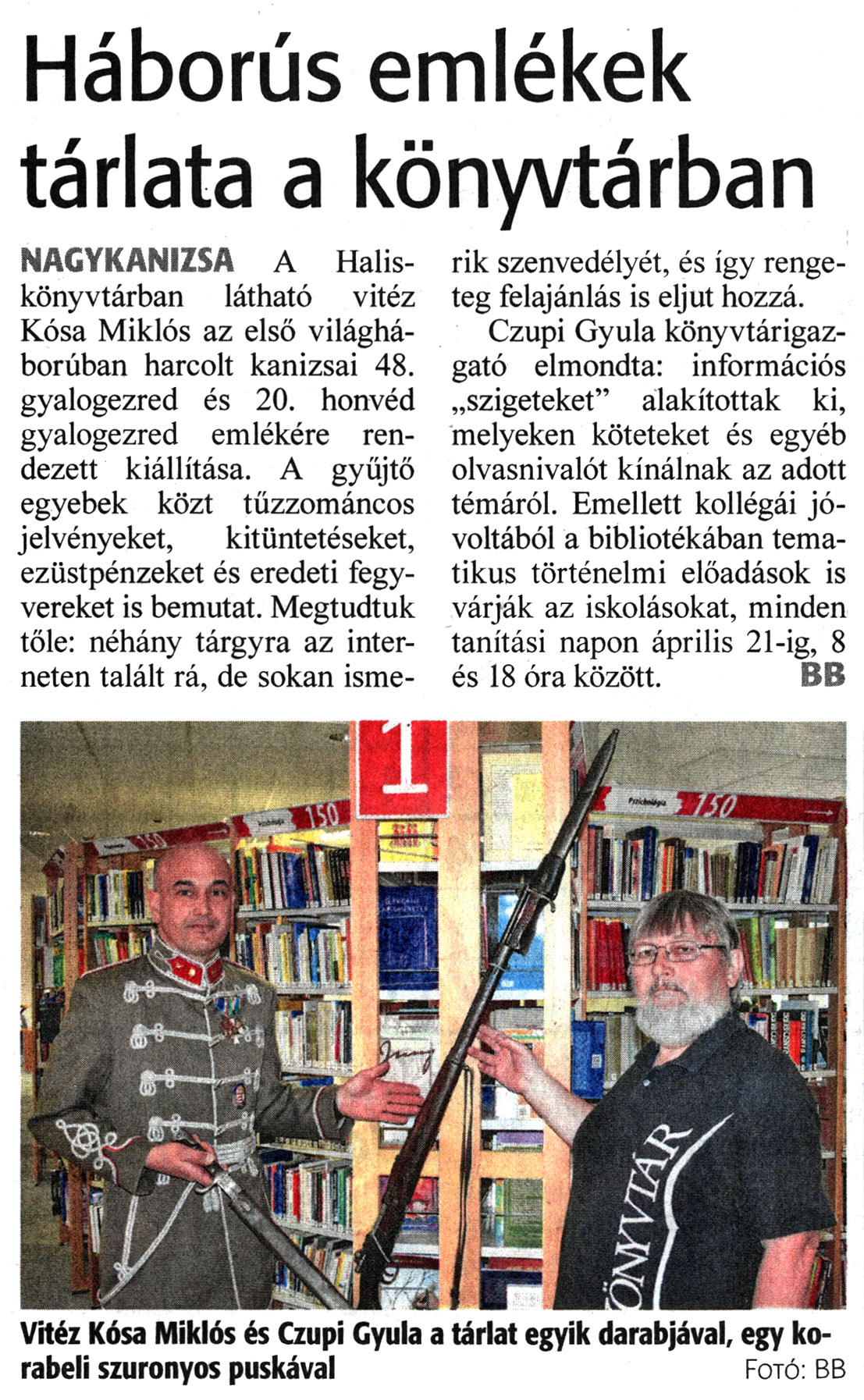 Nyilvános 1513 | 2002 | Zalai Hírlap 2022. március 23. 68. szám 20. oldal | Háborús emlékek tárlata a könyvtárban NAGYKANIZSA A Halis-könyvtárban látható vitéz Kósa Miklós az első világháborúban harcolt kanizsai 48. gyalogezred és 20. honvéd gyalogezred emlékére rendezett kiállítása. A gyűjtő egyebek közt tűzzománcos jelvényeket, kitüntetéseket, ezüstpénzeket és eredeti fegyvereket is bemutat. Megtudtuk tőle: néhány tárgyra az interneten talált rá, de sokan ismerik szenvedélyét, és így rengeteg felajánlás is eljut hozzá. Czupi Gyula könyvtárigazgató elmondta: információs „szigeteket" alakítottak ki, melyeken köteteket és egyéb olvasnivalót kínálnak az adott témáról. Emellett kollégái jóvoltából a bibliotékában tematikus történelmi előadások is várják az iskolásokat, minden tanítási napon április 21-ig, 8 és 18 óra között. BB Vitéz Kósa Miklós és Czupi Gyula a tárlat egyik darabjával, egy korabeli szuronyos puskával Fotó: BE |