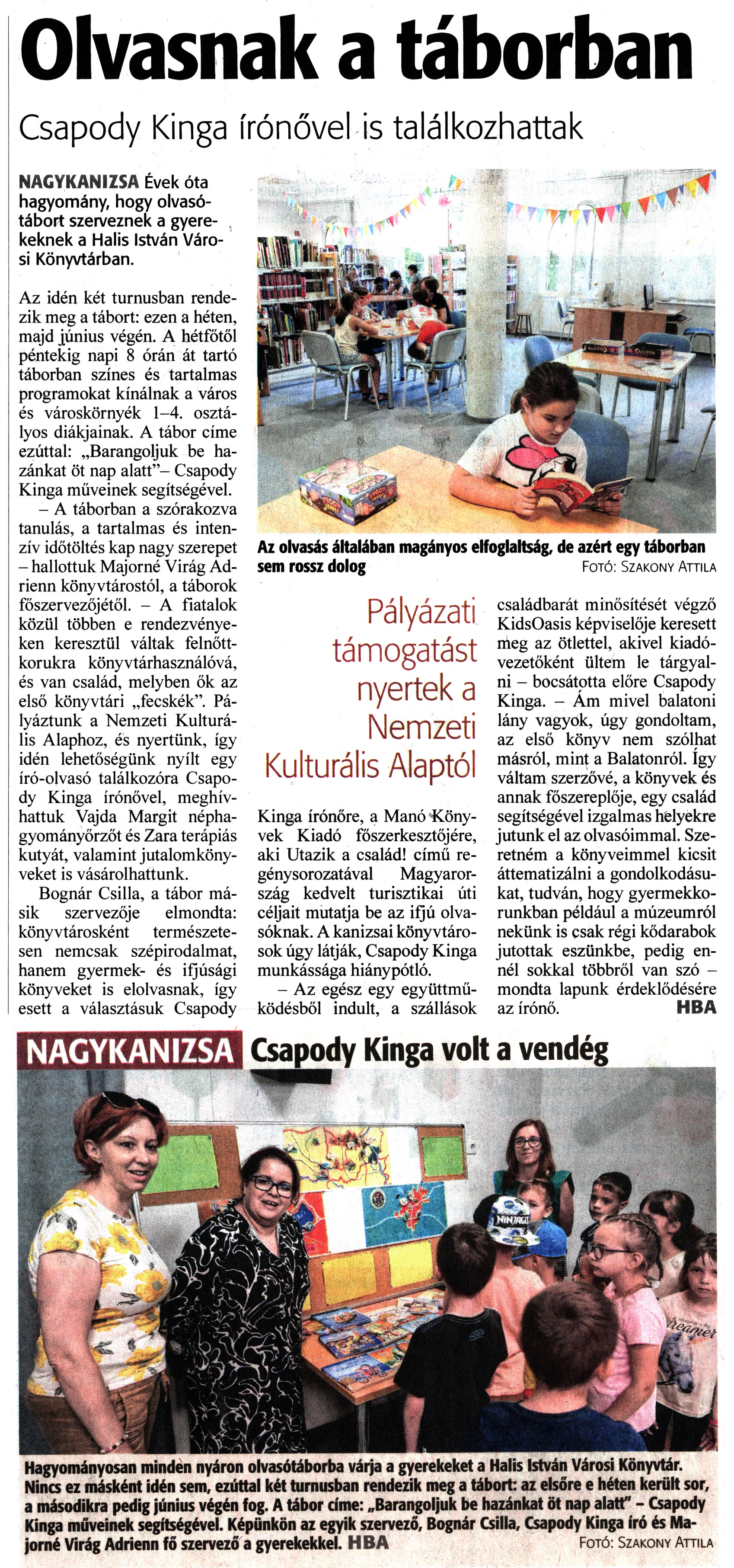 Nyilvános 1595 | 2088 | Zalai Hírlap 2022. június 25. 146. szám 1, 3. oldal | Olvasnak a táborban Csapody Kinga írónővel is találkozhattak Az olvasás általában magányos elfoglaltság, de azért egy táborban sem rossz dolog Fotó: Szakony Attila NAGYKANIZSA Évek óta hagyomány, hogy olvasótábort szerveznek a gyerekeknek a Halis István Városi Könyvtárban. Az idén két turnusban rendezik meg a tábort: ezen a héten, majd június végén. A hétfőtől péntekig napi 8 órán át tartó táborban színes és tartalmas programokat kínálnak a város és városkörnyék 1-4. osztályos diákjainak. A tábor címe ezúttal: „Barangoljuk be hazánkat öt nap alatt"- Csapody Kinga műveinek segítségével. - A táborban a szórakozva tanulás, a tartalmas és intenzív időtöltés kap nagy szerepet - hallottuk Majomé Virág Adrienn könyvtárostól, a táborok főszervezőjétől. - A fiatalok közül többen e rendezvényeken keresztül váltak felnőttkorukra könyvtárhasználóvá, és van család, melyben ők az első könyvtári „fecskék". Pályáztunk a Nemzeti Kulturális Alaphoz, és nyertünk, így idén lehetőségünk nyílt egy író-olvasó találkozóra Csapody Kinga írónővel, meghívhattuk Vajda Margit néphagyományőrzőt és Zara terápiás kutyát, valamint jutalomkönyveket is vásárolhattunk. Bognár Csilla, a tábor másik szervezője elmondta: könyvtárosként természetesen nemcsak szépirodalmat, hanem gyermek- és ifjúsági könyveket is elolvasnak, így esett a választásuk Csapody Kinga írónőre, a Manó Könyvek Kiadó főszerkesztőjére, aki Utazik a család! című regénysorozatával Magyarország kedvelt turisztikai úti céljait mutatja be az ifjú olvasóknak. A kanizsai könyvtárosok úgy látják, Csapody Kinga munkássága hiánypótló. - Az egész egy együttműködésből indult, a szállások családbarát minősítését végző KidsOasis képviselője keresett meg az ötlettel, akivel kiadóvezetőként ültem le tárgyalni - bocsátotta előre Csapody Kinga. - Ám mivel balatoni lány vagyok, úgy gondoltam, az első könyv nem szólhat másról, mint a Balatonról. így váltam szerzővé, a könyvek és annak főszereplője, egy család segítségével izgalmas helyekre jutunk el az olvasóimmal. Szeretném a könyveimmel kicsit áttematizálni a gondolkodásukat, tudván, hogy gyermekkorunkban például a múzeumról nekünk is csak régi kődarabok jutottak eszünkbe, pedig ennél sokkal többről van szó -mondta lapunk érdeklődésére az írónő. HBA Csapody Kinga volt a vendég Hagyományosan minden nyáron olvasótáborba várja a gyerekeket a Halis István Városi Könyvtár. Nincs ez másként idén sem, ezúttal két turnusban rendezik meg a tábort: az elsőre e héten került sor, a másodikra pedig június végén fog. A tábor címe: „Barangoljuk be hazánkat öt nap alatt" - Csapody Kinga műveinek segítségével. Képünkön az egyik szervező, Bognár Csilla, Csapody Kinga író és Majomé Virág Adrienn fő szervező a gyerekekkel. HBA Fotó: Szakony Attila |