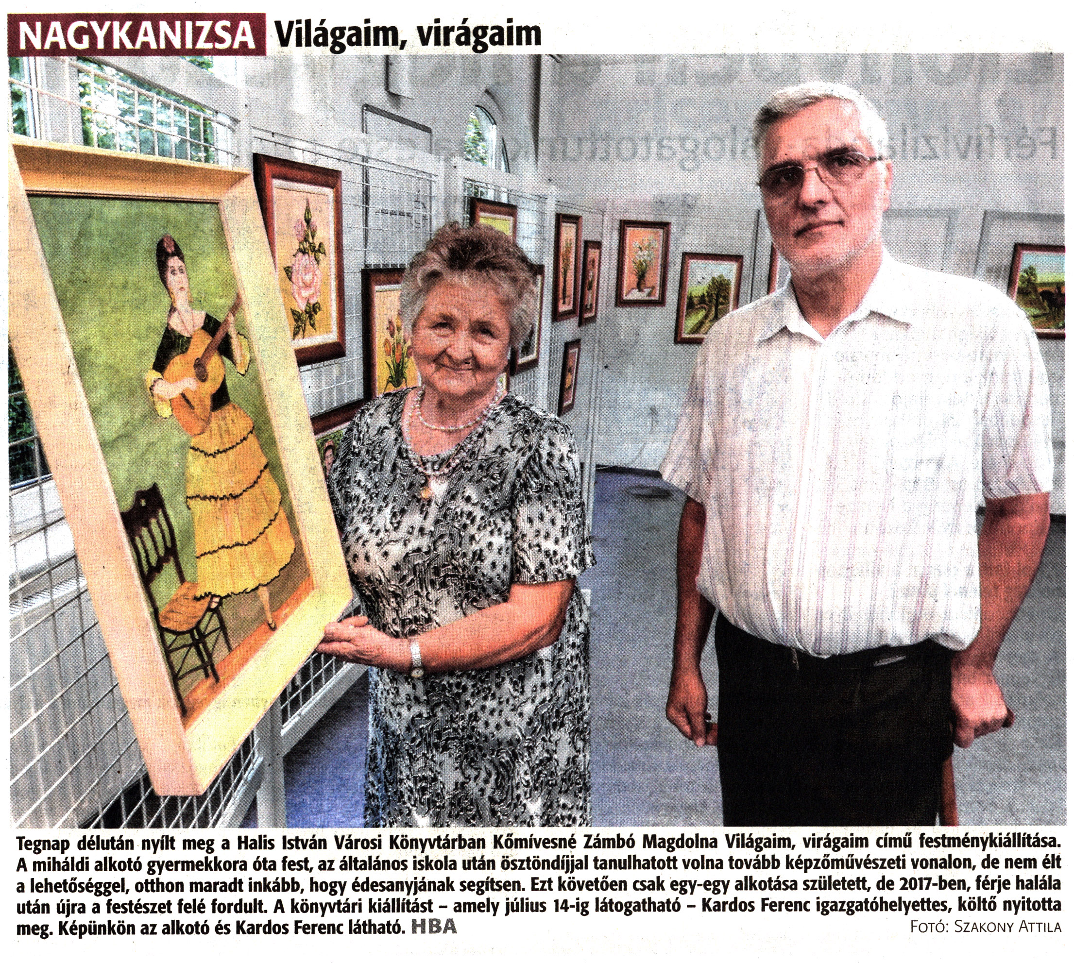 Nyilvános 1519 | 1779 | Zalai Hírlap 2022. június 29. 149. szám 16. oldal | NAGYKANIZSA Világaim, virágaim Tegnap délután nyílt meg a Halis István Városi Könyvtárban Kőmívesné Zámbó Magdolna Világaim, virágaim című festménykiállítása. A miháldi alkotó gyermekkora óta fest, az általános iskola után ösztöndíjjal tanulhatott volna tovább képzőművészeti vonalon, de nem élt a lehetőséggel, otthon maradt inkább, hogy édesanyjának segítsen. Ezt követően csak egy-egy alkotása született, de 2017-ben, férje halála után újra a festészet felé fordult. A könyvtári kiállítást - amely július 14-ig látogatható - Kardos Ferenc igazgatóhelyettes, költő nyitotta meg. Képünkön az alkotó és Kardos Ferenc látható. HBA Fotó: Szakony Attila |