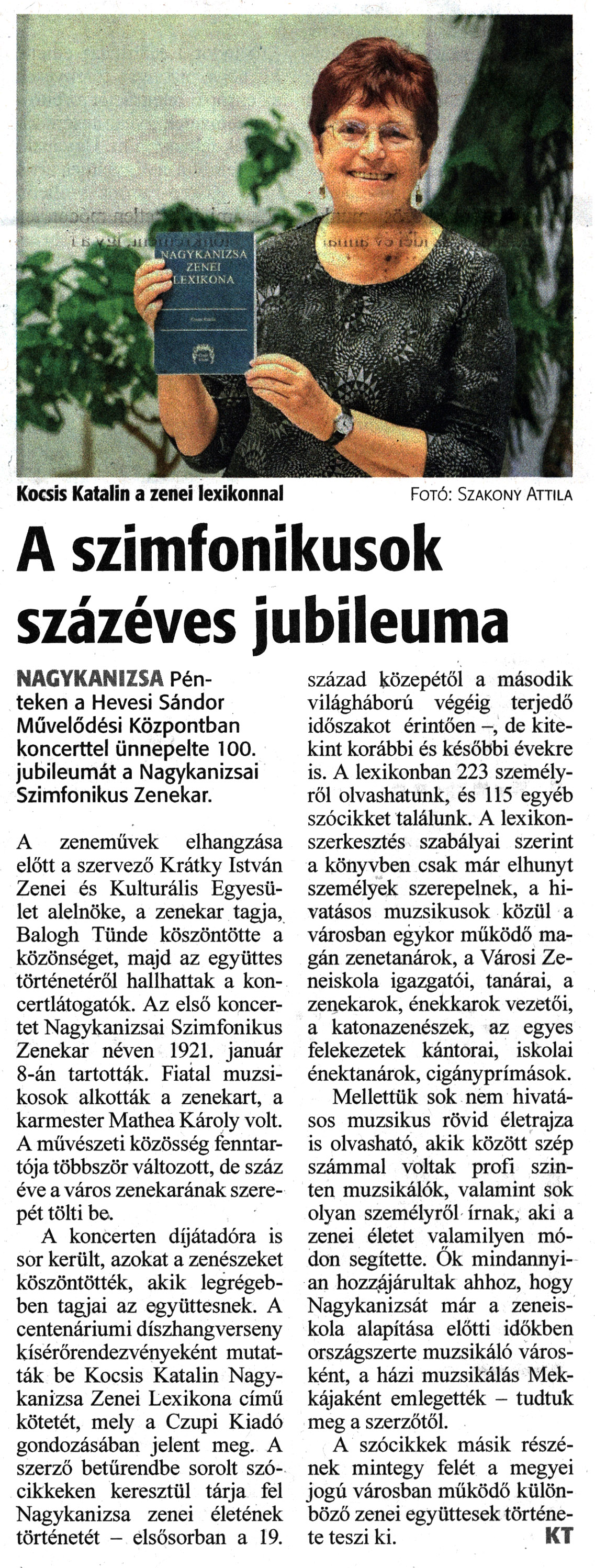 Nyilvános 1458 | 2034 | Zalai Hírlap 2022. október 31. 254. szám 4. oldal | Kocsis Katalin a zenei lexikonnal Fotó: Szakony Attila A szimfonikusok százéves jubileuma NAGYKANIZSA Pénteken a Hevesi Sándor Művelődési Központban koncerttel ünnepelte 100. jubileumát a Nagykanizsai Szimfonikus Zenekar. A zeneművek elhangzása előtt a szervező Krátky István Zenei és Kulturális Egyesület alelnöke, a zenekar tagja, Balogh Tünde köszöntötte a közönséget, majd az együttes történetéről hallhattak a koncertlátogatók. Az első koncertet Nagykanizsai Szimfonikus Zenekar néven 1921. január 8-án tartották. Fiatal muzsikosok alkották a zenekart, a karmester Mathea Károly volt. A művészeti közösség fenntartója többször változott, de száz éve a város zenekarának szerepét tölti be. A koncerten díjátadóra is sor került, azokat a zenészeket köszöntötték, akik legrégebben tagjai az együttesnek. A centenáriumi díszhangverseny kísérőrendezvényeként mutatták be Kocsis Katalin Nagykanizsa Zenei Lexikona című kötetét, mely a Czupi Kiadó gondozásában jelent meg. A szerző betűrendbe sorolt szócikkeken keresztül tárja fel Nagykanizsa zenei életének történetét - elsősorban a 19. század közepétől a második világháború végéig terjedő időszakot érintően -, de kitekint korábbi és későbbi évekre is. A lexikonban 223 személyről olvashatunk, és 115 egyéb szócikket találunk. A lexikonszerkesztés szabályai szerint a könyvben csak már elhunyt személyek szerepelnek, a hivatásos muzsikusok közül a városban egykor működő magán zenetanárok, a Városi Zeneiskola igazgatói, tanárai, a zenekarok, énekkarok vezetői, a katonazenészek, az egyes felekezetek kántorai, iskolai énektanárok, cigányprímások. Mellettük sok nem hivatásos muzsikus rövid életrajza is olvasható, akik között szép számmal voltak profi szinten muzsikálók, valamint sok olyan személyről írnak, aki a zenei életet valamilyen módon segítette. Ők mindannyian hozzájárultak ahhoz, hogy Nagykanizsát már a zeneiskola alapítása előtti időkben országszerte muzsikáló városként, a házi muzsikálás Mekkájaként emlegették - tudtuk meg a szerzőtől. A szócikkek másik részének mintegy felét a megyei jogú városban működő különböző zenei együttesek története teszi ki. KT |