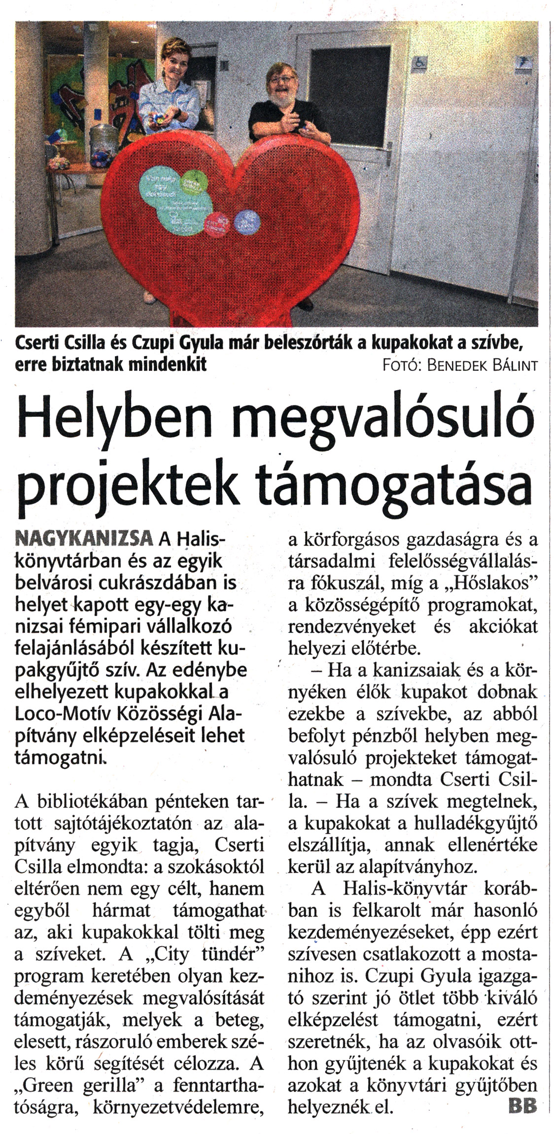 Nyilvános 1437 | 1790 | Zalai Hírlap 2022. november 2. 255. szám 2. oldal | Helyben megvalósuló projektek támogatása NAGYKANIZSA A Halis-könyvtárban és az egyik belvárosi cukrászdában is helyet kapott egy-egy kanizsai fémipari vállalkozó felajánlásából készített kupakgyűjtő szív. Az edénybe elhelyezett kupakokkal a Loco-Motív Közösségi Alapítvány elképzeléseit lehet támogatni. A bibliotékában pénteken tartott sajtótájékoztatón az alapítvány egyik tagja, Cserti Csilla elmondta: a szokásoktól eltérően nem egy célt, hanem egyből hármat támogathat az, aki kupakokkal tölti meg a szíveket. A „City tündér" program keretében olyan kezdeményezések megvalósítását támogatják, melyek a beteg, elesett, rászoruló emberek széles körű segítését célozza. A „Green gerilla" a fenntarthatóságra, környezetvédelemre, a körforgásos gazdaságra és a társadalmi felelősségvállalásra fókuszál, míg a „Hőslakos" a közösségépítő programokat, rendezvényeket és akciókat helyezi előtérbe. - Ha a kanizsaiak és a környéken élők kupakot dobnak ezekbe a szívekbe, az abból befolyt pénzből helyben megvalósuló projekteket támogathatnak - mondta Cserti Csilla. - Ha a szívek megtelnek, a kupakokat a hulladékgyűjtő elszállítja, annak ellenértéke kerül az alapítványhoz. A Halis-könyvtár korábban is felkarolt már hasonló kezdeményezéseket, épp ezért szívesen csatlakozott a mostanihoz is. Czupi Gyula igazgató szerint jó ötlet több kiváló elképzelést támogatni, ezért szeretnék, ha az olvasóik otthon gyűjtenék a kupakokat és azokat a könyvtári gyűjtőben helyeznék el. BB Cserti Csilla és Czupi Gyula már beleszórták a kupakokat a szívbe, erre biztatnak mindenkit Fotó: Benedek Bálint |