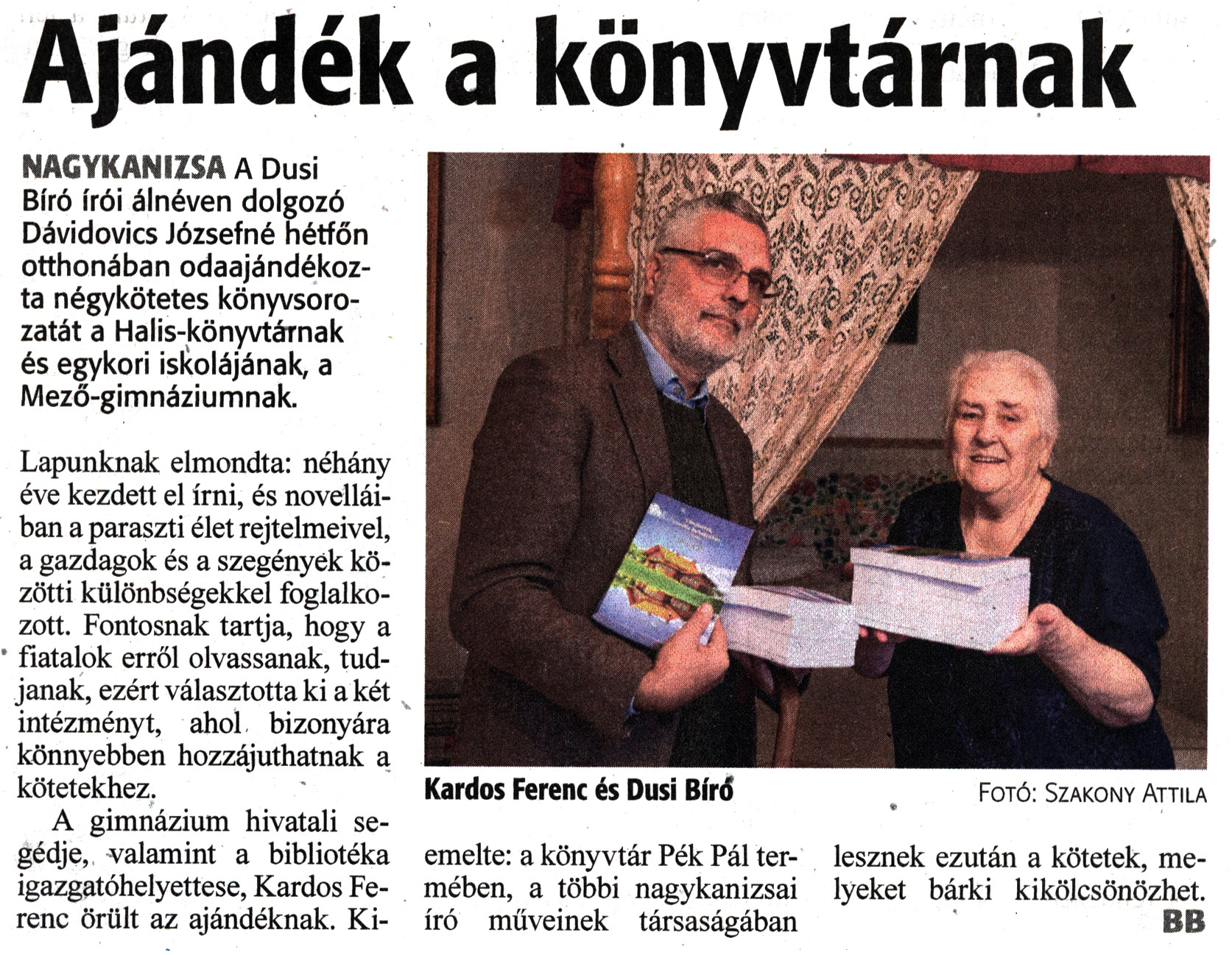 Nyilvános 1422 | 1681 | Zalai Hírlap 2022. november 16. 267. szám 2. oldal | Ajándék a könyvtárnak NAGYKANIZSA A Dusi Bíró írói álnéven dolgozó Dávidovics Józsefné hétfőn otthonában odaajándékozta négykötetes könyvsorozatát a Halis-könyvtárnak és egykori iskolájának, a Mező-gimnáziumnak. Lapunknak elmondta: néhány éve kezdett el írni, és novelláiban a paraszti élet rejtelmeivel, a gazdagok és a szegények közötti különbségekkel foglalkozott. Fontosnak tartja, hogy a fiatalok erről olvassanak, tudjanak, ezért választotta ki a két intézményt, ahol bizonyára könnyebben hozzájuthatnak a kötetekhez. A gimnázium hivatali segédje, valamint a bibliotéka igazgatóhelyettese, Kardos Ferenc örült az ajándéknak. Kiemelte: a könyvtár Pék Pál termében, a többi nagykanizsai író műveinek társaságában lesznek ezután a kötetek, melyeket bárki kikölcsönözhet. BB Kardos Ferenc és Dusi Bírd Fotó: Szakony Attila |