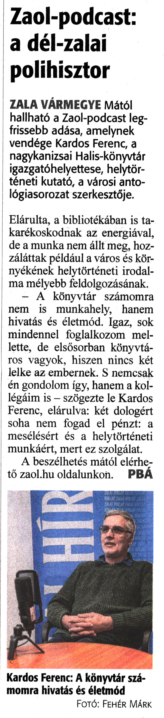 Nyilvános 1413 | 1699 | Zalai Hírlap 2023. február 10. 35. szám 1. oldal | Zaol-podcast: a dél-zalai polihisztor ZALA VÁRMEGYE Mától hallható a Zaol-podcast legfrissebb adása, amelynek vendége Kardos Ferenc, a nagykanizsai Halis-könyvtár igazgatóhelyettese, helytörténeti kutató, a városi antológiasorozat szerkesztője. Elárulta, a bibliotékában is takarékoskodnak az energiával, de a munka nem állt meg, hozzáláttak például a város és környékének helytörténeti irodalma mélyebb feldolgozásának. - A könyvtár számomra nem is munkahely, hanem hivatás és életmód. Igaz, sok mindennel foglalkozom mellette, de elsősorban könyvtáros vagyok, hiszen nincs két lelke az embernek. S nemcsak én gondolom így, hanem a kollégáim is - szögezte le Kardos Ferenc, elárulva: két dologért soha nem fogad el pénzt: a mesélésért és a helytörténeti munkáért, mert ez szolgálat. A beszélhetés mától elérhető zaol.hu oldalunkon. PBÁ Kardos Ferenc: A könyvtár számomra hivatás és életmód Fotó: Fehér Márk |