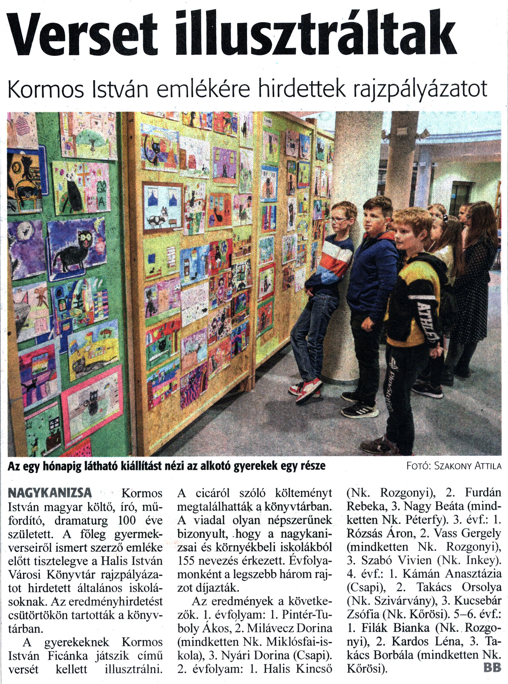 Nyilvános 1407 | 1754 | Zalai Hírlap 2023. május 19. 115. szám 16. oldal | Verset illusztráltak Kormos István emlékére hirdettek rajzpályázatot NAGYKANIZSA Kormos István magyar költő, író, műfordító, dramaturg 100 éve született. A főleg gyermekverseiről ismert szerző emléke előtt tisztelegve a Halis István Városi Könyvtár rajzpályázatot hirdetett általános iskolásoknak. Az eredményhirdetést csütörtökön tartották a könyvtárban. A gyerekeknek Kormos István Ficánka játszik című versét kellett illusztrálni. A cicáról szóló költeményt megtalálhatták a könyvtárban. A viadal olyan népszerűnek bizonyult, hogy a nagykanizsai és környékbeli iskolákból 155 nevezés érkezett. Évfolyamonként a legszebb három rajzot díjazták. Az eredmények a következők. 1. évfolyam: 1. Pintér-Tuboly Ákos, 2. Milávecz Dorina (mindketten Nk. Miklósfai-iskola), 3. Nyári Dorina (Csapi). 2. évfolyam: 1. Halis Kincső (Nk. Rozgonyi), 2. Furdán Rebeka, 3. Nagy Beáta (mindketten Nk. Péterfy). 3. évf.: 1. Rózsás Áron, 2. Vass Gergely (mindketten Nk. Rozgonyi), 3. Szabó Vivien (Nk. Inkey). 4. évf.: 1. Kámán Anasztázia (Csapi), 2. Takács Orsolya (Nk. Szivárvány), 3. Kucsebár Zsófia (Nk. Körösi). 5-6. évf.: 1. Filák Bianka (Nk. Rozgonyi), 2. Kardos Léna, 3. Takács Borbála (mindketten Nk. Körösi). BB Az egy hónapig látható kiállítást nézi az alkotó gyerekek egy része Fotó: Szakony Attila |