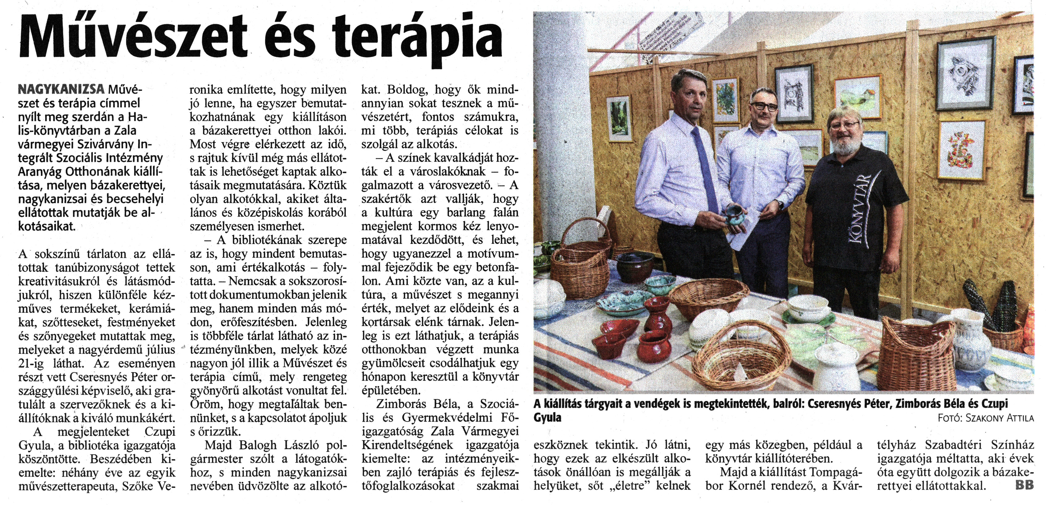 Nyilvános 1450 | 1934 | Zalai Hírlap 2023. június 22. 143. szám 5. oldal | Művészet és terápia NAGYKANIZSA Művészet és terápia címmel nyílt meg szerdán a Halis-könyvtárban a Zala vármegyei Szivárvány Integrált Szociális Intézmény Aranyág Otthonának kiállítása, melyen bázakerettyei, nagykanizsai és becsehelyi ellátottak mutatják be alkotásaikat. A sokszínű tárlaton az ellátottak tanúbizonyságot tettek kreativitásukról és látásmódjukról, hiszen különféle kézműves termékeket, kerámiákat, szőtteseket, festményeket és szőnyegeket mutattak meg, melyeket a nagyérdemű július 21-ig láthat. Az eseményen részt vett Cseresnyés Péter országgyűlési képviselő, aki gratulált a szervezőknek és a kiállítóknak a kiváló munkákért. A megjelenteket Czupi Gyula, a bibliotéka igazgatója köszöntötte. Beszédében kiemelte: néhány éve az egyik művészetterapeuta, Szőke Veronika említette, hogy milyen jó lenne, ha egyszer bemutatkozhatnának egy kiállításon a bázakerettyei otthon lakói. Most végre elérkezett az idő, s rajtuk kívül még más ellátottak is lehetőséget kaptak alkotásaik megmutatására. Köztük olyan alkotókkal, akiket általános és középiskolás korából személyesen ismerhet. - A bibliotékának szerepe az is, hogy mindent bemutasson, ami értékalkotás - folytatta. - Nemcsak a sokszorosított dokumentumokban jelenik meg, hanem minden más módon, erőfeszítésben. Jelenleg is többféle tárlat látható az intézményünkben, melyek közé nagyon jól illik a Művészet és terápia című, mely rengeteg gyönyörű alkotást vonultat fel. Öröm, hogy megtaláltak bennünket, s a kapcsolatot ápoljuk s őrizzük. Majd Balogh László polgármester szólt a látogatókhoz, s minden nagykanizsai nevében üdvözölte az alkotókat. Boldog, hogy ők mindannyian sokat tesznek a művészetért, fontos számukra, mi több, terápiás célokat is szolgál az alkotás. - A színek kavalkádját hozták el a városlakóknak - fogalmazott a városvezető. - A szakértők azt vallják, hogy a kultúra egy barlang falán megjelent kormos kéz lenyomatával kezdődött, és lehet, hogy ugyanezzel a motívummal fejeződik be egy betonfalon. Ami közte van, az a kultúra, a művészet s megannyi érték, melyet az elődeink és a kortársak elénk tárnak. Jelenleg is ezt láthatjuk, a terápiás otthonokban végzett munka gyümölcseit csodálhatjuk egy hónapon keresztül a könyvtár épületében. Zimborás Béla, a Szociális és Gyermekvédelmi Főigazgatóság Zala Vármegyei Kirendeltségének igazgatója kiemelte: az intézményeikben zajló terápiás és fejlesztőfoglalkozásokat szakmai eszköznek tekintik. Jó látni, hogy ezek az elkészült alkotások önállóan is megállják a helyüket, sőt „életre" kelnek egy más közegben, például a könyvtár kiállítóterében. Majd a kiállítást Tompagábor Kornél rendező, a Kvártélyház Szabadtéri Színház igazgatója méltatta, aki évek óta együtt dolgozik a bázakerettyei ellátottakkal. BB A kiállítás tárgyait a vendégek is megtekintették, balról: Cseresnyés Péter, Zimborás Béla és Czupi Gyula Fotó: Szakony Attila |
