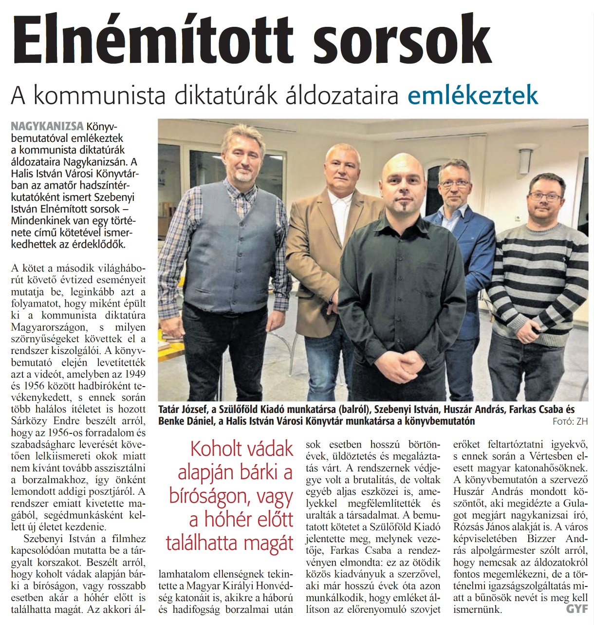 Nyilvános 1320 | 1554 | Zalai Hírlap 2024. február 23. 46. szám 2. oldal | Elnémított sorsok A kommunista diktatúrák áldozataira emlékeztek Tatár József, a Szülőföld Kiadó munkatársa (balról), Szebenyi István, Huszár András, Farkas Csaba és Benke Dániel, a Halis István Városi Könyvtár munkatársa a könyvbemutatón Fotó: ZH NAGYKANIZSA Könyvbemutatóval emlékeztek a kommunista diktatúrák áldozataira Nagykanizsán. A Halis István Városi Könyvtárban az amatőr hadszíntérkutatóként ismert Szebenyi István Elnémított sorsok - Mindenkinek van egy története című kötetével ismerkedhettek az érdeklődők. A kötet a második világháborút követő évtized eseményeit mutatja be, leginkább azt a folyamatot, hogy miként épült ki a kommunista diktatúra Magyarországon, s milyen szörnyűségeket követtek el a rendszer kiszolgálói. A könyvbemutató elején levetítették azt a videót, amelyben az 1949 és 1956 között hadbíróként tevékenykedett, s ennek során több halálos ítéletet is hozott Sárközy Endre beszélt arról, hogy az 1956-os forradalom és szabadságharc leverését követően lelkiismereti okok miatt nem kívánt tovább asszisztálni a borzalmakhoz, így önként lemondott addigi posztjáról. A rendszer emiatt kivetette magából, segédmunkásként kellett új életet kezdenie. Szebenyi István a filmhez kapcsolódóan mutatta be a tárgyalt korszakot. Beszélt arról, hogy koholt vádak alapján bárki a bíróságon, vagy rosszabb esetben akár a hóhér előtt is találhatta magát. Az akkori államhatalom ellenségnek tekintette a Magyar Királyi Honvédség katonáit is, akikre a háború és hadifogság borzalmai után sok esetben hosszú börtönévek, üldöztetés és megaláztatás várt. A rendszernek védjegye volt a brutalitás, de voltak egyéb aljas eszközei is, amelyekkel megfélemlítették és uralták a társadalmat. A bemutatott kötetet a Szülőföld Kiadó jelentette meg, melynek vezetője, Farkas Csaba a rendezvényen elmondta: ez az ötödik közös kiadványuk a szerzővel, aki már hosszú évek óta azon munkálkodik, hogy emléket állítson az előrenyomuló szovjet erőket feltartóztatni igyekvő, s ennek során a Vértesben elesett magyar katonahősöknek. A könyvbemutatón a szervező Huszár András mondott köszöntőt, aki megidézte a Gulagot megjárt nagykanizsai író, Rózsás János alakját is. A város képviseletében Bizzer András alpolgármester szólt arról, hogy nemcsak az áldozatokról fontos megemlékezni, de a történelmi igazságszolgáltatás miatt a bűnösök nevét is meg kell ismernünk. |