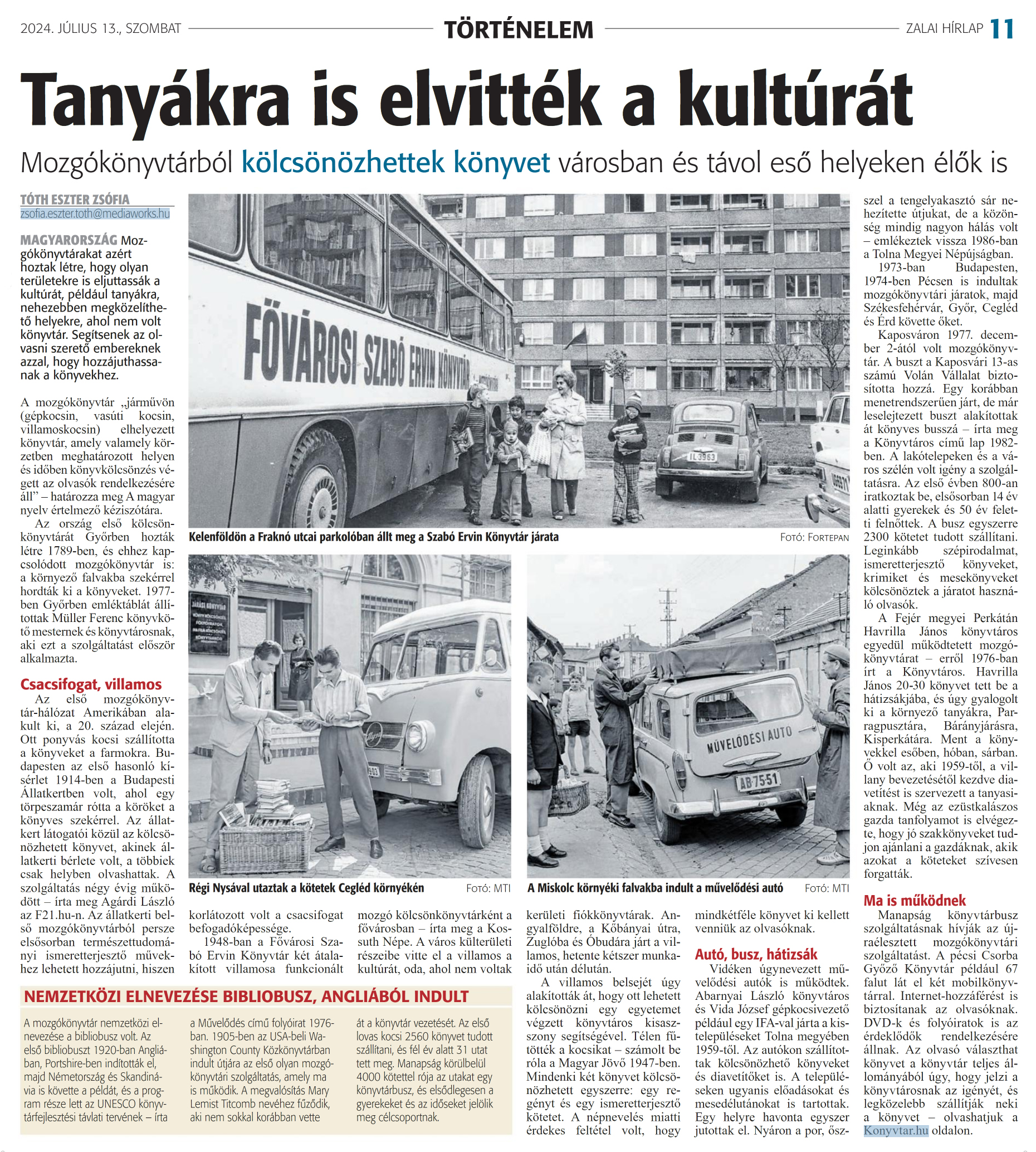 Nyilvános 1272 | 1477 | Zalai Hírlap 2024. július 13. 162. szám 11. oldal | Tanyákra is elvitték a kultúrát Mozgókönyvtárból kölcsönözhettek könyvet városban és távol eső helyeken élők is TÓTH ESZTER ZSÓFIA zsofia.eszter.toth@mediaworks.hu MAGYARORSZÁG Mozgókönyvtárakat azért hoztak létre, hogy olyan területekre is eljuttassák a kultúrát, például tanyákra, nehezebben megközelíthető helyekre, ahol nem volt könyvtár. Segítsenek az olvasni szerető embereknek azzal, hogy hozzájuthassanak a könyvekhez. A mozgókönyvtár „járművön (gépkocsin, vasúti kocsin, villamoskocsin) elhelyezett könyvtár, amely valamely körzetben meghatározott helyen és időben könyvkölcsönzés végett az olvasók rendelkezésére áll" - határozza meg A magyar nyelv értelmező kéziszótára. Az ország első kölcsön-könyvtárát Győrben hozták létre 1789-ben, és ehhez kapcsolódott mozgókönyvtár is: a környező falvakba szekérrel hordták ki a könyveket. 1977-ben Győrben emléktáblát állítottak Müller Ferenc könyvkötő mesternek és könyvtárosnak, aki ezt a szolsáltatást először alkalmazta. Az első mozgókönyvtár-hálózat Amerikában alakult ki, a 20. század elején. Ott ponyvás kocsi szállította a könyveket a farmokra. Budapesten az első hasonló kísérlet 1914-ben a Budapesti Állatkertben volt, ahol egy törpeszamár rótta a köröket a könyves szekérrel. Az állatkert látogatói közül az kölcsönözhetett könyvet, akinek állatkerti bérlete volt, a többiek csak helyben olvashattak. A szolgáltatás négy évig működött - írta meg Agárdi László az F21.hu-n. Az állatkerti belső mozgókönyvtárból persze elsősorban természettudományi ismeretterjesztő müvekhez lehetett hozzájutni, hiszen korlátozott volt a csacsifogat befogadóképessége. 1948-ban a Fővárosi Szabó Ervin Könyvtár két átalakított villamosa funkcionált mozgó kölcsönkönyvtárként a fővárosban - írta meg a Kossuth Népe. A város külterületi részeibe vitte el a villamos a kultúrát, oda, ahol nem voltak kerületi fiókkönyvtárak. Angyalföldre, a Kőbányai útra, Zuglóba és Óbudára járt a villamos, hetente kétszer munkaidő után délután. A villamos belsejét úgy alakították át, hogy ott lehetett kölcsönözni egy egyetemet végzett könyvtáros kisasszony segítségével. Télen fűtötték a kocsikat - számolt be róla a Magyar Jövő 1947-ben. Mindenki két könyvet kölcsönözhetett egyszerre: egy regényt és egy ismeretterjesztő kötetet. A népnevelés miatti érdekes feltétel volt, hogy mindkétféle könyvet ki kellett venniük az olvasóknak. Vidéken úgynevezett művelődési autók is működtek. Abarnyai László könyvtáros és Vida József gépkocsivezető például egy IFA-val járta a kistelepüléseket Tolna megyében 1959-től. Az autókon szállítottak kölcsönözhető könyveket és diavetítőket is. A településeken ugyanis előadásokat és mesedélutánokat is tartottak. Egy helyre havonta egyszer jutottak el. Nyáron a por, ősszel a tengelyakasztó sár nehezítette útjukat, de a közönség mindig nagyon hálás volt - emlékeztek vissza 1986-ban a Tolna Megyei Népújságban. 1973-ban Budapesten, 1974-ben Pécsen is indultak mozgókönyvtári járatok, majd Székesfehérvár, Győr, Cegléd és Érd követte őket. Kaposváron 1977. december 2-ától volt mozgókönyvtár. A buszt a Kaposvári 13-as számú Volán Vállalat biztosította hozzá. Egy korábban menetrendszerűen járt, de már leselejtezett buszt alakítottak át könyves busszá - írta meg a Könyvtáros című lap 1982-ben. A lakótelepeken és a város szélén volt igény a szolgáltatásra. Az első évben 800-an iratkoztak be, elsősorban 14 év alatti gyerekek és 50 év feletti felnőttek. A busz egyszerre 2300 kötetet tudott szállítani. Leginkább szépirodalmat, ismeretterjesztő könyveket, krimiket és mesekönyveket kölcsönöztek a járatot használó olvasók. A Fejér megyei Perkátán Havrilla János könyvtáros egyedül működtetett mozgókönyvtárat - erről 1976-ban írt a Könyvtáros. Havrilla János 20-30 könyvet tett be a hátizsákjába, és úgy gyalogolt ki a környező tanyákra, Parragpusztára, Bárányjárásra, Kisperkátára. Ment a könyvekkel esőben, hóban, sárban. Ő volt az, aki 1959-től, a villany bevezetésétől kezdve diavetítést is szervezett a tanyasiaknak. Még az ezüstkalászos gazda tanfolyamot is elvégezte, hogy jó szakkönyveket tudjon ajánlani a gazdáknak, akik azokat a köteteket szívesen forgatták. Ma is működnek Manapság könyvtárbusz szolgáltatásnak hívják az újraélesztett mozgókönyvtári szolgáltatást. A pécsi Csorba Győző Könyvtár például 67 falut lát el két mobilkönyvtárral. Internet-hozzáférést is biztosítanak az olvasóknak. DVD-k és folyóiratok is az érdeklődők rendelkezésére állnak. Az olvasó választhat könyvet a könyvtár teljes állományából úgy, hogy jelzi a könyvtárosnak az igényét, és legközelebb szállítják neki a könyvet - olvashatjuk a Konyvtar.hu oldalon. NEMZETKÖZI ELNEVEZÉSE BIBLIOBUSZ, ANGLIÁBÓL INDULT A mozgókönyvtár nemzetközi elnevezése a bibliobusz volt. Az első bibliobuszt 1920-ban Angliában, Portshire-ben indították el, majd Németország és Skandinávia is követte a példát, és a program része lett az UNESCO könyvtárfejlesztési távlati tervének - írta a Művelődés című folyóirat 1976-ban. 1905-ben az USA-beli Washington County Közkönyvtárban indult útjára az első olyan mozgókönyvtári szolgáltatás, amely ma is működik. A megvalósítás Mary Lemist Titcomb nevéhez fűződik, aki nem sokkal korábban vette át a könyvtár vezetését. Az első lovas kocsi 2560 könyvet tudott szállítani, és fél év alatt 31 utat tett meg. Manapság körülbelül 4000 kötettel rója az utakat egy könyvtárbu