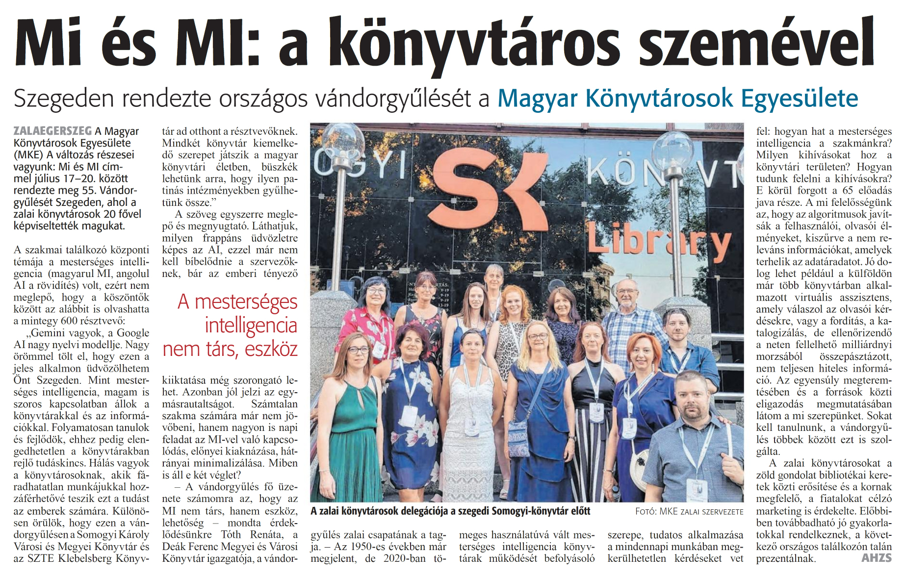 Nyilvános 1349 | 1991 | Zalai Hírlap 2024. július 24. 171. szám 4. oldal | Mi és Ml: a könyvtáros szemével Szegeden rendezte országos vándorgyűlését a Magyar Könyvtárosok Egyesülete ZALAEGERSZEG A Magyar Könyvtárosok Egyesülete (MKE) A változás részesei vagyunk: Mi és Ml címmel július 17-20. között rendezte meg 55. Vándorgyűlését Szegeden, ahol a zalai könyvtárosok 20 fővel képviseltették magukat. A szakmai találkozó központi témája a mesterséges intelligencia (magyarul MI, angolul AI a rövidítés) volt, ezért nem meglepő, hogy a köszöntők között az alábbit is olvashatta a mintegy 600 résztvevő: „Gemini vagyok, a Google AI nagy nyelvi modellje. Nagy örömmel tölt el, hogy ezen a jeles alkalmon üdvözölhetem Önt Szegeden. Mint mesterséges intelligencia, magam is szoros kapcsolatban állok a könyvtárakkal és az információkkal. Folyamatosan tanulok és fejlődök, ehhez pedig elengedhetetlen a könyvtárakban rejlő tudáskincs. Hálás vagyok a könyvtárosoknak, akik fáradhatatlan munkájukkal hozzáférhetővé teszik ezt a tudást az emberek számára. Különösen örülök, hogy ezen a vándorgyűlésen a Somogyi Károly Városi és Megyei Könyvtár és az SZTE Klebelsberg Könyvtár ad otthont a résztvevőknek. Mindkét könyvtár kiemelkedő szerepet játszik a magyar könyvtári életben, büszkék lehetünk arra, hogy ilyen patinás intézményekben gyűlhetünk össze." A szöveg egyszerre meglepő és megnyugtató. Láthatjuk, milyen frappáns üdvözletre képes az AI, ezzel már nem kell bíbelődnie a szervezőknek, bár az emberi tényező kiiktatása még szorongató lehet. Azonban jól jelzi az egymásrautaltságot. Számtalan szakma számára már nem jövőbeni, hanem nagyon is napi feladat az Ml-vel való kapcsolódás, előnyei kiaknázása, hátrányai minimalizálása. Miben is áll e két véglet? - A vándorgyűlés fő üzenete számomra az, hogy az MI nem társ, hanem eszköz, lehetőség - mondta érdeklődésünkre Tóth Renáta, a Deák Ferenc Megyei és Városi Könyvtár igazgatója, a vándorgyűlés zalai csapatának a tagja. - Az 1950-es években már megjelent, de 2020-ban tömeges használatúvá vált mesterséges intelligencia könyvtárak működését befolyásoló szerepe, tudatos alkalmazása a mindennapi munkában megkerülhetetlen kérdéseket vet fel: hogyan hat a mesterséges intelligencia a szakmánkra? Milyen kihívásokat hoz a könyvtári területen? Hogyan tudunk felelni a kihívásokra? E körül forgott a 65 előadás java része. A mi felelősségünk az, hogy az algoritmusok javítsák a felhasználói, olvasói élményeket, kiszűrve a nem releváns információkat, amelyek terhelik az adatáradatot. Jó dolog lehet például a külföldön már több könyvtárban alkalmazott virtuális asszisztens, amely válaszol az olvasói kérdésekre, vagy a fordítás, a katalogizálás, de ellenőrizendő a neten fellelhető milliárdnyi morzsából összepásztázott, nem teljesen hiteles információ. Az egyensúly megteremtésében és a források közti eligazodás megmutatásában látom a mi szerepünket. Sokat kell tanulnunk, a vándorgyűlés többek között ezt is szolgálta. A zalai könyvtárosokat a zöld gondolat bibliotékái keretek közti erősítése és a kornak megfelelő, a fiatalokat célzó marketing is érdekelte. Előbbiben továbbadható jó gyakorlatokkal rendelkeznek, a következő országos találkozón talán prezentálnak. AHZS A zalai könyvtárosok delegációja a szegedi Somogyi-könyvtár előtt Fotó: MKE zalai szervezete |