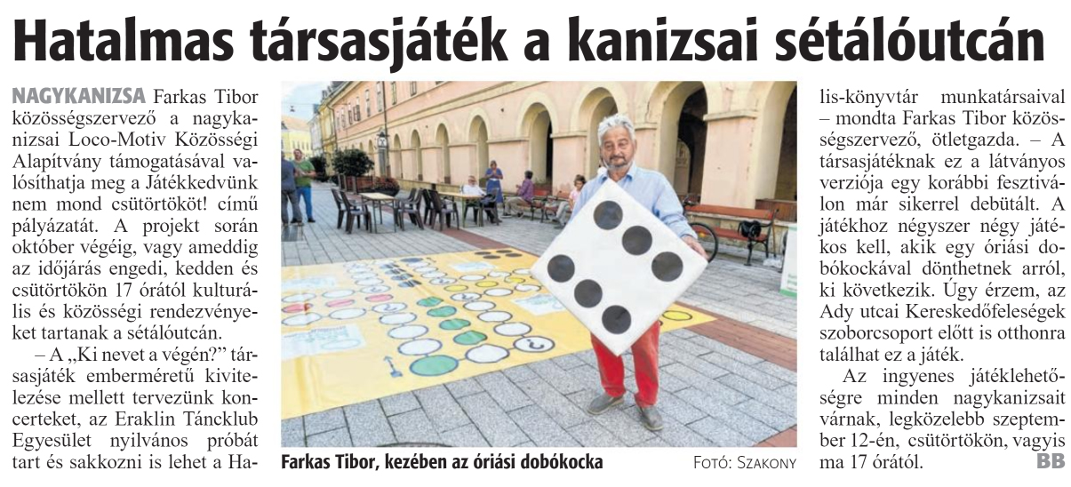 Nyilvános 1312 | 1571 | Zalai Hírlap 2024. szeptember 12. 213. szám 6. oldal | Hatalmas társasjáték a kanizsai sétálóutcán NAGYKANIZSA Farkas Tibor közösségszervező a nagykanizsai Loco-Motiv Közösségi Alapítvány támogatásával valósíthatja meg a Játékkedvünk nem mond csütörtököt! című pályázatát. A projekt során október végéig, vagy ameddig az időjárás engedi, kedden és csütörtökön 17 órától kulturális és közösségi rendezvényeket tartanak a sétálóutcán. - A ,,Ki nevet a végén?" társasjáték emberméretü kivitelezése mellett tervezünk koncerteket, az Eraklin Táncklub Egyesület nyilvános próbát tart és sakkozni is lehet a Halis-könyvtár munkatársaival - mondta Farkas Tibor közösségszervező, ötletgazda. - A társasjátéknak ez a látványos verziója egy korábbi fesztiválon már sikerrel debütált. A játékhoz négyszer négy játékos kell, akik egy óriási dobókockával dönthetnek arról, ki következik. Ugy érzem, az Ady utcai Kereskedőfeleségek szoborcsoport előtt is otthonra találhat ez a játék. Az ingyenes játéklehetőségre minden nagykanizsait várnak, legközelebb szeptember 12-én, csütörtökön, vagyis ma 17 órától. BB Farkas Tibor, kezében az óriási dobókocka Fotó: Szakony |