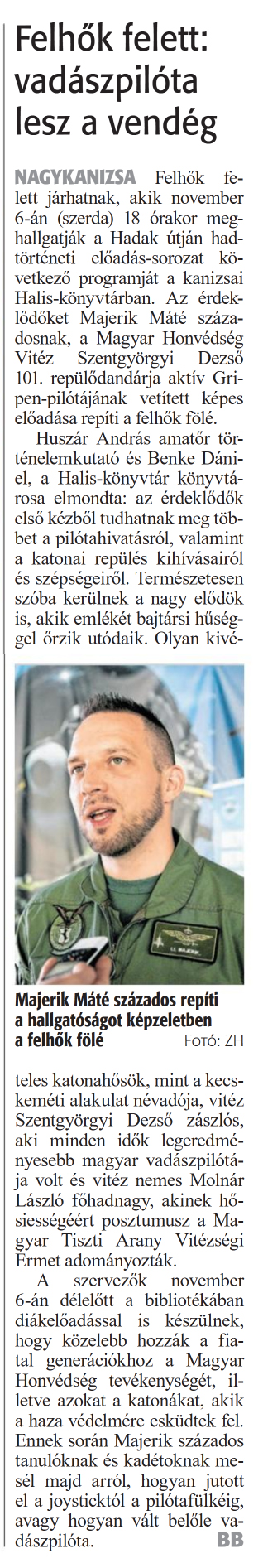 Nyilvános 1241 | 1456 | Zalai Hírlap 2024. október 31. 254. szám 6. oldal | Felhők felett: vadászpilóta lesz a vendég NAGYKANIZSA Felhők felett járhatnak, akik november 6-án (szerda) 18 órakor meghallgatják a Hadak útján hadtörténeti előadás-sorozat következő programját a kanizsai Halis-könyvtárban. Az érdeklődőket Majerik Máté századosnak, a Magyar Honvédség Vitéz Szentgyörgyi Dezső 101. repülődandárja aktív Gripen-pilótájának vetített képes előadása repíti a felhők fölé. Huszár András amatőr történelemkutató és Benke Dániel, a Halis-könyvtár könyvtárosa elmondta: az érdeklődők első kézből tudhatnak meg többet a pilótahivatásról, valamint a katonai repülés kihívásairól és szépségeiről. Természetesen szóba kerülnek a nagy elődök is, akik emlékét bajtársi hűséggel őrzik utódaik. Olyan kivételes katonahősök, mint a kecskeméti alakulat névadója, vitéz Szentgyörgyi Dezső zászlós, aki minden idők legeredményesebb magyar vadászpilótája volt és vitéz nemes Molnár László főhadnagy, akinek hősiességéért posztumusz a Magyar Tiszti Arany Vitézségi Érmet adományozták. A szervezők november 6-án délelőtt a bibliotékában diákelőadással is készülnek, hogy közelebb hozzák a fiatal generációkhoz a Magyar Honvédség tevékenységét, illetve azokat a katonákat, akik a haza védelmére esküdtek fel. Ennek során Majerik százados tanulóknak és kadétoknak mesél majd arról, hogyan jutott el a joysticktói a pilótafülkéig, avagy hogyan vált belőle vadászpilóta. BB |