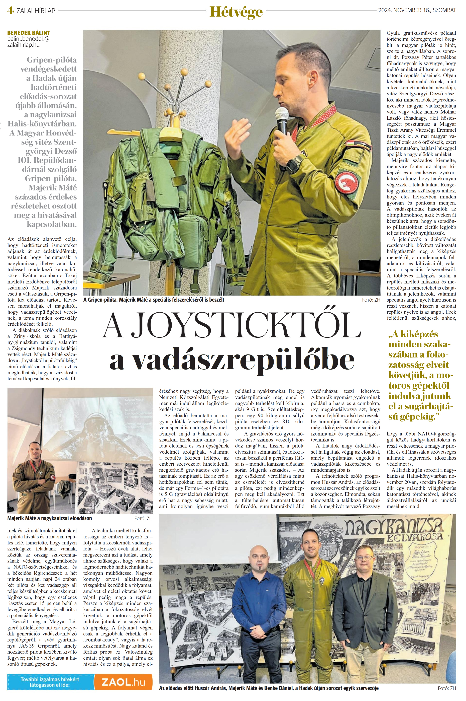 Nyilvános 1216 | 1302 | Zalai Hírlap 2024. november 16. 267. szám 4. oldal | A JOYSTICKTŐL a vadászrepülőbe BENEDEK BÁLINT balint.benedek@ zalaihirlap.hu Gripen-pilóta vendégeskedett a Hadak útján hadtörténeti előadás-sorozat ujabb állomásán, a nagykanizsai Halis-könyvtárban. A Magyar Honvédség vitéz Szent-györgyi Dezső 101. Repülődandárnál szolgáló Gripen-pilóta, Majerik Máté százados érdekes részleteket osztott meg a hivatásával kapcsolatban. Az előadások alapvető célja, hogy hadtörténeti ismereteket adjanak át az érdeklődőknek, valamint hogy bemutassák a nagykanizsai, illetve zalai kötődéssel rendelkező katonahősöket. Ezúttal azonban a Tokaj melletti Erdőbénye településről származó Majerik századosra esett a választásuk, a Gripen-pilóta két előadást tartott. Kevesen mondhatják el magukról, hogy vadászrepülőgépet vezetnek, a téma minden korosztály érdeklődését felkelti. A diákoknak szóló előadáson a Zrínyi-iskola és a Batthyány-gimnázium tanulói, valamint a Zsigmondy-technikum kadétjai vettek részt. Majerik Máté százados a „Joysticktől a pilótafülkéig" című előadásán a fiatalok azt is megtudhatták, hogy a századost a témával kapcsolatos könyvek, filmek és szimulátorok indították el a pilóta hivatás és a katonai repülés felé. Ismertette, hogy milyen szerteágazó feladataik vannak, köztük az ország szuverenitásának védelme, együttműködés a NATO-szövetségeseinkkel és a békeidős légirendészet: a hét minden napján, napi 24 órában két pilóta és két vadászgép áll teljes készültségben a kecskeméti légibázison, hogy egy esetleges riasztás esetén 15 percen belül a levegőbe emelkedjen és elhárítsa a potenciális fenyegetést. Beszélt még a Magyar Légierő kötelékébe tartozó negyedik generációs vadászbombázó repülőgépről, a svéd gyártmányú JAS 39 Gripenről, amely hozzáértő pilóta kezében kiváló fegyver; méltó vetélytársa a hasonló típusú gépeknek. -A technika mellett kulcsfontosságú az emberi tényező is - folytatta a kecskeméti vadászpilóta. - Hosszú évek alatt lehet megszerezni azt a tudást, amely ahhoz szükséges, hogy valaki a legmodernebb haditechnikát hatékonyan működtesse. Nagyon komoly orvosi alkalmassági vizsgákkal kezdődik a folyamat, amelyet elméleti oktatás követ, végül pedig maga a repülés. Persze a kiképzés minden szakaszában a fokozatosság elvét követjük, a motoros gépektől indulva jutunk el a sugárhajtású gépekig. A folyamat végén csak a legjobbak érhetik el a „combat-ready", vagyis a harckész minősítést. Nagy kaland és férfias próba ez. Valószínűleg emiatt olyan sok fiatal álma ez hivatás és ez a pálya, amely eléréséhez nagy segítség, hogy a Nemzeti Közszolgálati Egyetemen már indul állami légiközlekedési szak is. Az előadó bemutatta a magyar pilóták felszerelését, kezdve a speciális nadrággal és mellénnyel, majd a bakanccsal és sisakkal. Ezek mind-mind a pilóta életének és testi épségének védelmét szolgálják, valamint a repülés közben fellépő, az emberi szervezetet hihetetlenül megterhelő gravitációs erő hatásainak tompítását. Ez az erő a hétköznapokban fel sem tűnik, de már egy Forma-l-es pilótára is 5 G (gravitációs) oldalirányú erő hat a nagy sebesség miatt, ami komolyan igénybe veszi például a nyakizmokat. De egy vadászpilótának még ennél is nagyobb terhelést kell kibírnia, akár 9 G-t is. Szemléltetésképpen: egy 90 kilogramm súlyú pilóta esetében ez 810 kilogramm terhelést jelent. - A gravitációs erő gyors növekedése számos veszélyt hordoz magában, hiszen a pilóta elveszíti a színlátását, és fokozatosan beszűkül a perifériás látása is - mondta kanizsai előadása során Majerik százados. - Az agy csökkenő vérellátása miatt az eszméletét is elveszíthetné a pilóta, ezt pedig mindenképpen meg kell akadályozni. Ezt a túlterhelésre automatikusan felfúvódó, gumikamrákból álló védőruházat teszi lehetővé. A kamrák nyomást gyakorolnak például a hasra és a combokra, így megakadályozva azt, hogy a vér a fejből az alsó testrészekbe áramoljon. Kulcsfontosságú még a kiképzés során elsajátított izommunka és speciális légzéstechnika is. A fiatalok nagy érdeklődéssel hallgatták végig az előadást, amely bepillantást engedett a vadászpilóták kiképzésébe és mindennapjaiba is. A felnőtteknek szóló programon Huszár András, az előadássorozat szervezőinek egyike szólt a közönséghez. Elmondta, sokan támogatták a találkozó létrejöttét. A meghívót tervező Pozsgay Gyula grafikusművész például történelmi képregényeivel öregbíti a magyar pilóták jó hírét, szerte a nagyvilágban. A soproni dr. Pozsgay Péter tartalékos főhadnagynak is szívügye, hogy méltó emléket állítson a magyar katonai repülés hőseinek. Olyan kivételes katonahősöknek, mint a kecskeméti alakulat névadója, vitéz Szentgyörgyi Dezső zászlós, aki minden idők legeredményesebb magyar vadászpilótája volt, vagy vitéz nemes Molnár László főhadnagy, akit hősiességéért posztumusz a Magyar Tiszti Arany Vitézségi Éremmel tüntettek ki. A mai magyar vadászpilóták az ő örököseik, ezért példamutatóan, bajtársi hűséggel ápolják a nagy elődök emlékét. Majerik százados kiemelte, mennyire fontos az alapos kiképzés és a rendszeres gyakorlatozás ahhoz, hogy hatékonyan végezzék a feladataikat. Rengeteg gyakorlás szükséges ahhoz, hogy éles helyzetben minden gyorsan és pontosan menjen. A vadászpilóták hasonlók az olimpikonokhoz, akik éveken át készülnek arra, hogy a sorsdöntő pillanatokban életük legjobb teljesítményét nyújthassák. A jelenlévők a diákelőadás részletesebb, bővített változatát hallgathatták meg 