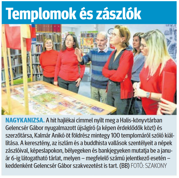 Nyilvános 1222 | 1450 | Zalai Hírlap 2024. december 4. 282. szám 3. oldal | Templomok és zászlók NAGYKANIZSA. A hit hajlékai címmel nyílt meg a Halis-könyvtárban Gelencsér Gábor nyugalmazott újságíró (a képen érdeklődők közt) és szerzőtársa, Kalmár Anikó öt földrész mintegy 100 templomáról szóló kiállítása. A keresztény, az iszlám és a buddhista vallások szentélyeit a népek zászlóival, képeslapokon, bélyegeken és bankjegyeken mutatja be a január 6-ig látogatható tárlat, melyen - megfelelő számú jelentkező esetén - keddenként Gelencsér Gábor szakvezetést is tart. (BB) FOTÓ: SZAKONY |