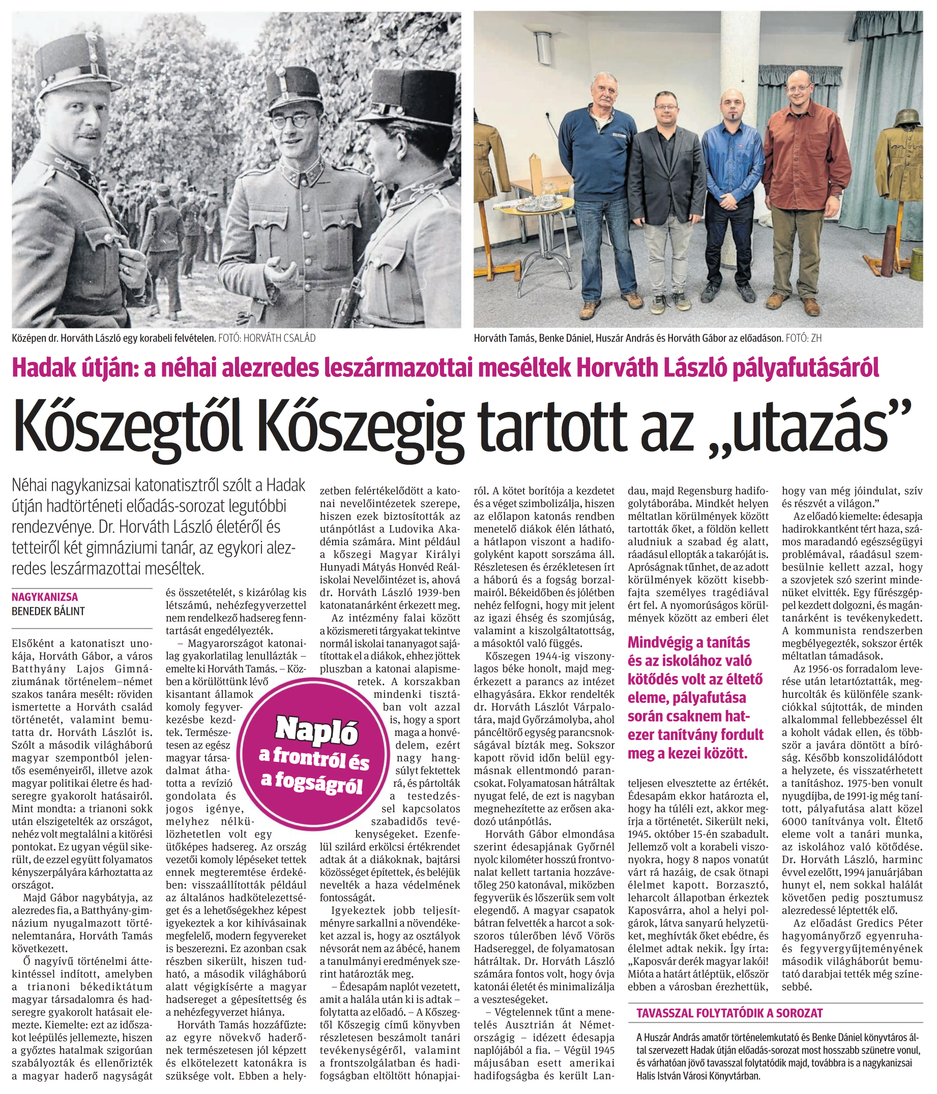 Nyilvános 1269 | 1611 | Zalai Hírlap 2024. december 10. 287. szám 6. oldal | Hadak útján: a néhai alezredes leszármazottai meséltek Horváth László pályafutásáról Kőszegtől Kőszegig tartott az „utazás" Néhai nagykanizsai katonatisztről szólt a Hadak útján hadtörténeti előadás-sorozat legutóbbi rendezvénye. Dr. Horváth László életéről és tetteiről két gimnáziumi tanár, az egykori alezredes leszármazottai meséltek. NAGYKANIZSA BENEDEK BÁLINT Elsőként a katonatiszt unokája, Horváth Gábor, a város Batthyány Lajos Gimnáziumának történelem-német szakos tanára mesélt: röviden ismertette a Horváth család történetét, valamint bemutatta dr. Horváth Lászlót is. Szólt a második világháború magyar szempontból jelentős eseményeiről, illetve azok magyar politikai életre és hadseregre gyakorolt hatásairól. Mint mondta: a trianoni sokk után elszigetelték az országot, nehéz volt megtalálni a kitörési pontokat. Ez ugyan végül sikerült, de ezzel együtt folyamatos kényszerpályára kárhoztatta az országot. Majd Gábor nagybátyja, az alezredes fia, a Batthyány-gimnázium nyugalmazott történelemtanára, Horváth Tamás következett. Ő nagyívű történelmi áttekintéssel indított, amelyben a trianoni békediktátum magyar társadalomra és hadseregre gyakorolt hatásait elemezte. Kiemelte: ezt az időszakot leépülés jellemezte, hiszen a győztes hatalmak szigorúan szabályozták és ellenőrizték a magyar haderő nagyságát és összetételét, s kizárólag kis létszámú, nehézfegyverzettel nem rendelkező hadsereg fenntartását engedélyezték. - Magyarországot katonailag gyakorlatilag lenullázták - emelte ki Horváth Tamás. - Közben a körülöttünk lévő kisantant államok komoly fegyverkezésbe kezdtek. Természetesen az egész magyar társadalmat áthatotta a revízió gondolata és jogos igénye, melyhez nélkülözhetetlen volt egy ütőképes hadsereg. Az ország vezetői komoly lépéseket tettek ennek megteremtése érdekében: visszaállították például az általános hadkötelezettséget és a lehetőségekhez képest igyekeztek a kor kihívásainak megfelelő, modern fegyvereket is beszerezni. Ez azonban csak részben sikerült, hiszen tudható, a második világháború alatt végigkísérte a magyar hadsereget a gépesítettség és a nehézfegyverzet hiánya. Horváth Tamás hozzáfűzte: az egyre növekvő haderőnek természetesen jól képzett és elkötelezett katonákra is szüksége volt. Ebben a helyzetben felértékelődött a katonai nevelőintézetek szerepe, hiszen ezek biztosították az utánpótlást a Ludovika Akadémia számára. Mint például a kőszegi Magyar Királyi Hunyadi Mátyás Honvéd Reáliskolai Nevelőintézet is, ahová dr. Horváth László 1939-ben katonatanárként érkezett meg. Az intézmény falai között a közismereti tárgyakat tekintve normál iskolai tananyagot sajátítottak el a diákok, ehhez jöttek pluszban a katonai alapismeretek. A korszakban mindenki tisztában volt azzal is, hogy a sport maga a honvédelem, ezért nagy hangsúlyt fektettek rá, és pártolták a testedzéssel kapcsolatos szabadidős tevékenységeket. Ezenfelül szilárd erkölcsi értékrendet adtak át a diákoknak, bajtársi közösséget építettek, és beléjük nevelték a haza védelmének fontosságát. Igyekeztek jobb teljesítményre sarkallni a növendékeket azzal is, hogy az osztályok névsorát nem az ábécé, hanem a tanulmányi eredmények szerint határozták meg. - Édesapám naplót vezetett, amit a halála után ki is adtak - folytatta az előadó. - A Kőszegtől Kőszegig című könyvben részletesen beszámolt tanári tevékenységéről, valamint a frontszolgálatban és hadifogságban eltöltött hónapjairól. A kötet borítója a kezdetet és a véget szimbolizálja, hiszen az előlapon katonás rendben menetelő diákok élén látható, a hátlapon viszont a hadifogolyként kapott sorszáma áll. Részletesen és érzékletesen írt a háború és a fogság borzalmairól. Békeidőben és jólétben nehéz felfogni, hogy mit jelent az igazi éhség és szomjúság, valamint a kiszolgáltatottság, a másoktól való függés. Kőszegen 1944-ig viszonylagos béke honolt, majd megérkezett a parancs az intézet elhagyására. Ekkor rendelték dr. Horváth Lászlót Várpalotára, majd Győrzámolyba, ahol páncéltörő egység parancsnokságával bízták meg. Sokszor kapott rövid időn belül egymásnak ellentmondó parancsokat. Folyamatosan hátráltak nyugat felé, de ezt is nagyban megnehezítette az erősen akadozó utánpótlás. Horváth Gábor elmondása szerint édesapjának Győrnél nyolc kilométer hosszú frontvonalat kellett tartania hozzávetőleg 250 katonával, miközben fegyverük és lőszerük sem volt elegendő. A magyar csapatok bátran felvették a harcot a sokszoros túlerőben lévő Vörös Hadsereggel, de folyamatosan hátráltak. Dr. Horváth László számára fontos volt, hogy óvja katonái életét és minimalizálja a veszteségeket. - Végtelennek tűnt a menetelés Ausztrián át Németországig - idézett édesapja naplójából a fia. - Végül 1945 májusában esett amerikai hadifogságba és került Landau, majd Regensburg hadifogolytáborába. Mindkét helyen méltatlan körülmények között tartották őket, a földön kellett aludniuk a szabad ég alatt, ráadásul ellopták a takaróját is. Apróságnak tűnhet, de az adott körülmények között kisebbfajta személyes tragédiával ért fel. A nyomorúságos körülmények között az emberi élet teljesen elvesztette az értékét. Édesapám ekkor határozta el, hogy ha túléli ezt, akkor megírja a történetét. Sikerült neki, 1945. október 15-én szabadult. Jellemző volt a korabeli viszonyokra, hogy 8 napos vonatút várt rá hazáig, de csak ötnapi élelmet kapott. Borzasztó, leharcolt állapotban érkeztek Kapos