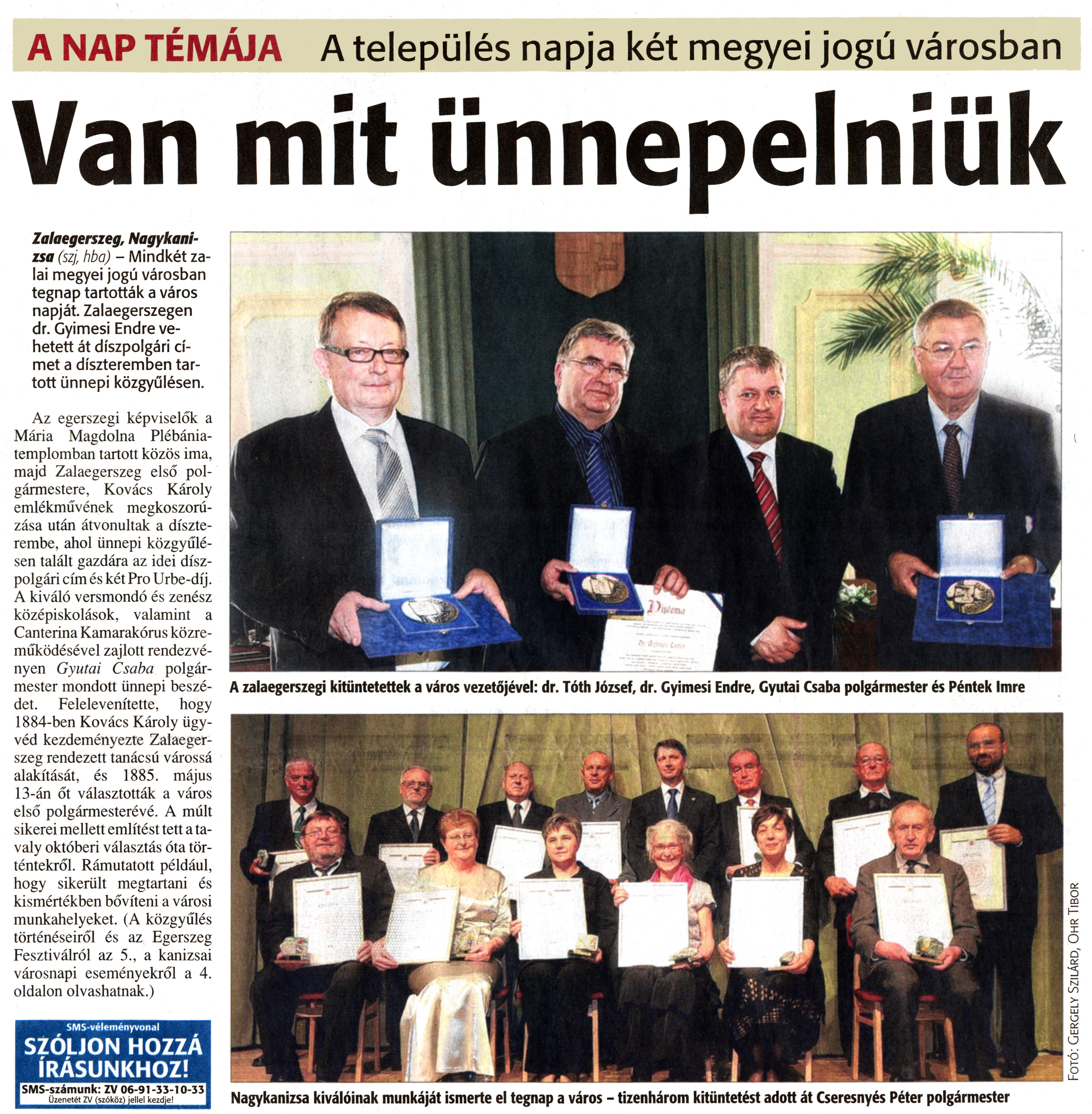 Nyilvános 1967 | 4336 | Zalai Hírlap 2011. május 14. 112. szám 1. oldal - Van mit ünnepelniük | A cikk szövege: A NAP TÉMÁJA A település napja két megyei jogú városban Van mit ünnepelniük Zalaegerszeg, Nagykanizsa (szj, hba) - Mindkét zalai megyei jogú városban tegnap tartották a város napját. Zalaegerszegen dr. Gyimesi Endre vehetett át díszpolgári címet a díszteremben tartott ünnepi közgyűlésen. Az egerszegi képviselők a Mária Magdolna Plébániatemplomban tartott közös ima, majd Zalaegerszeg első polgármestere, Kovács Károly emlékművének megkoszorúzása után átvonultak a díszterembe, ahol ünnepi közgyűlésen talált gazdára az idei díszpolgári cím és két Pro Urbe-díj. A kiváló versmondó és zenész középiskolások, valamint a Canterina Kamarakórus közreműködésével zajlott rendezvényen Gyutai Csaba polgármester mondott ünnepi beszédet. Felelevenítette, hogy 1884-ben Kovács Károly ügyvéd kezdeményezte Zalaegerszeg rendezett tanácsú várossá alakítását, és 1885. május 13-án őt választották a város első polgármesterévé. A múlt sikerei mellett említést tett a tavaly októberi választás óta történtekről. Rámutatott például, hogy sikerült megtartani és kismértékben bővíteni a városi munkahelyeket. (A közgyűlés történéseiről és az Egerszeg Fesztiválról az 5., a kanizsai városnapi eseményekről a 4. oldalon olvashatnak.) A zalaegerszegi kitüntetettek a város vezetőjével: dr. Tóth József, dr. Gyimesi Endre, Gyutai Csaba polgármester és Péntek Imre Nagykanizsa kiválóinak munkáját ismerte el tegnap a város - tizenhárom kitüntetést adott át Cseresnyés Péter polgármester |