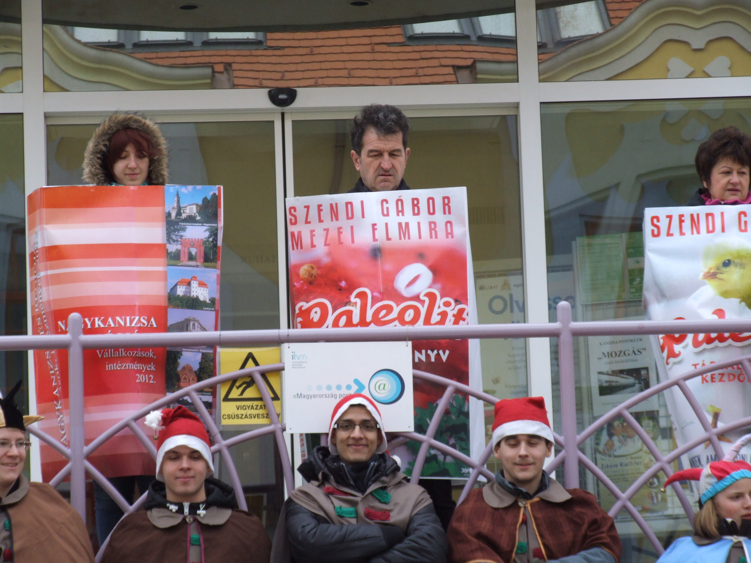 Nyilvános 1251 | 2886 | 2013. február 9. A farsangi fánkfesztiválra készülve felhívásban kértük olvasóinkat, hogy öltsék magukra kedves könyvüket. Egy „könyvespolcnyi” jelentkező vette magára kedves olvasmányát, az ő vonulásukról készültek ezek a képek. A környezetükben néhol láthatók a Nagykanizsai Gólyalábasok, akik szintén a könyvtárhoz kötődnek. A „felvonuló kötetek” a könyvtár épületében még megtekinthetők. | |