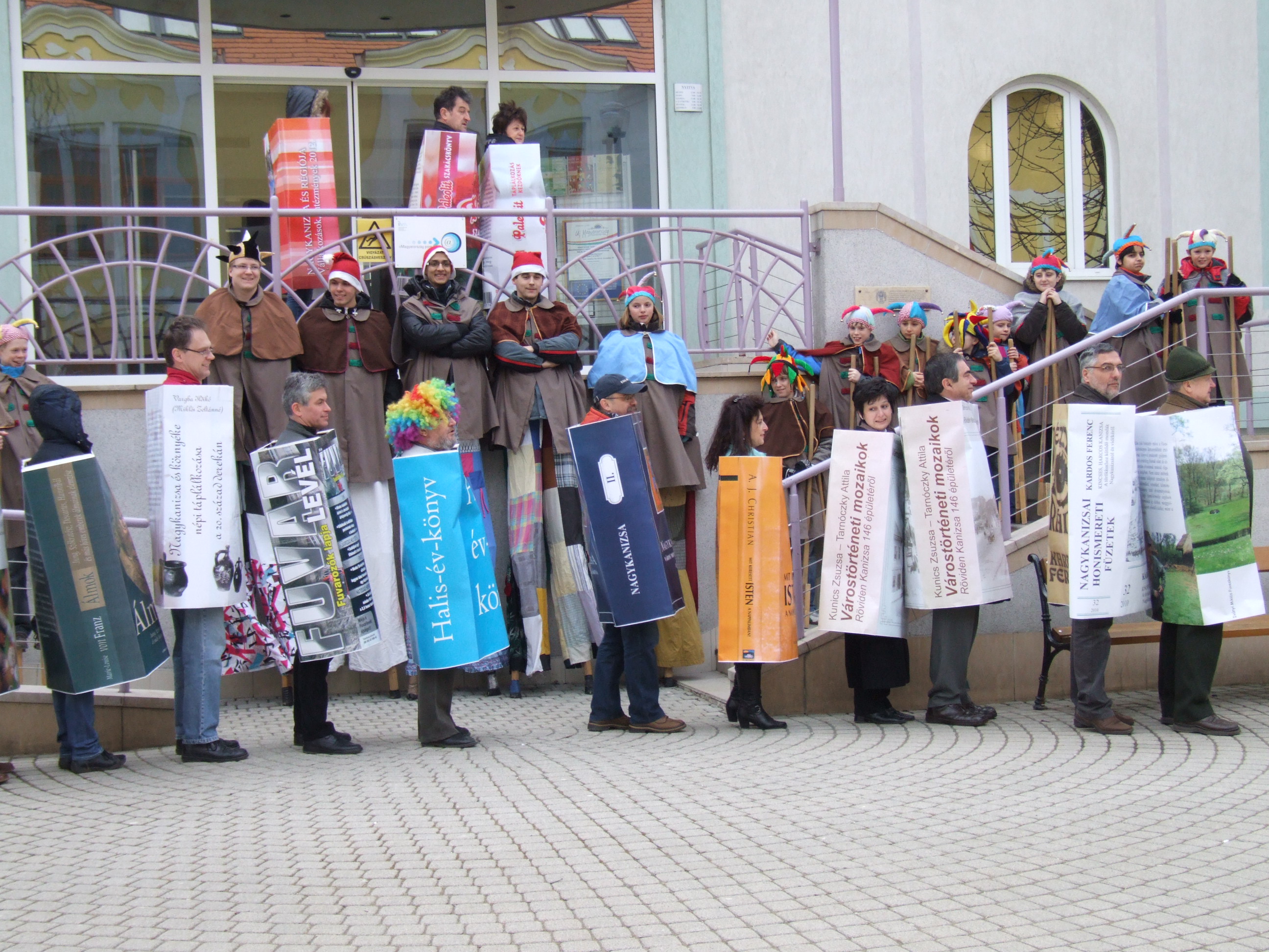 Nyilvános 1273 | 2728 | 2013. február 9. A farsangi fánkfesztiválra készülve felhívásban kértük olvasóinkat, hogy öltsék magukra kedves könyvüket. Egy „könyvespolcnyi” jelentkező vette magára kedves olvasmányát, az ő vonulásukról készültek ezek a képek. A környezetükben néhol láthatók a Nagykanizsai Gólyalábasok, akik szintén a könyvtárhoz kötődnek. A „felvonuló kötetek” a könyvtár épületében még megtekinthetők. | |