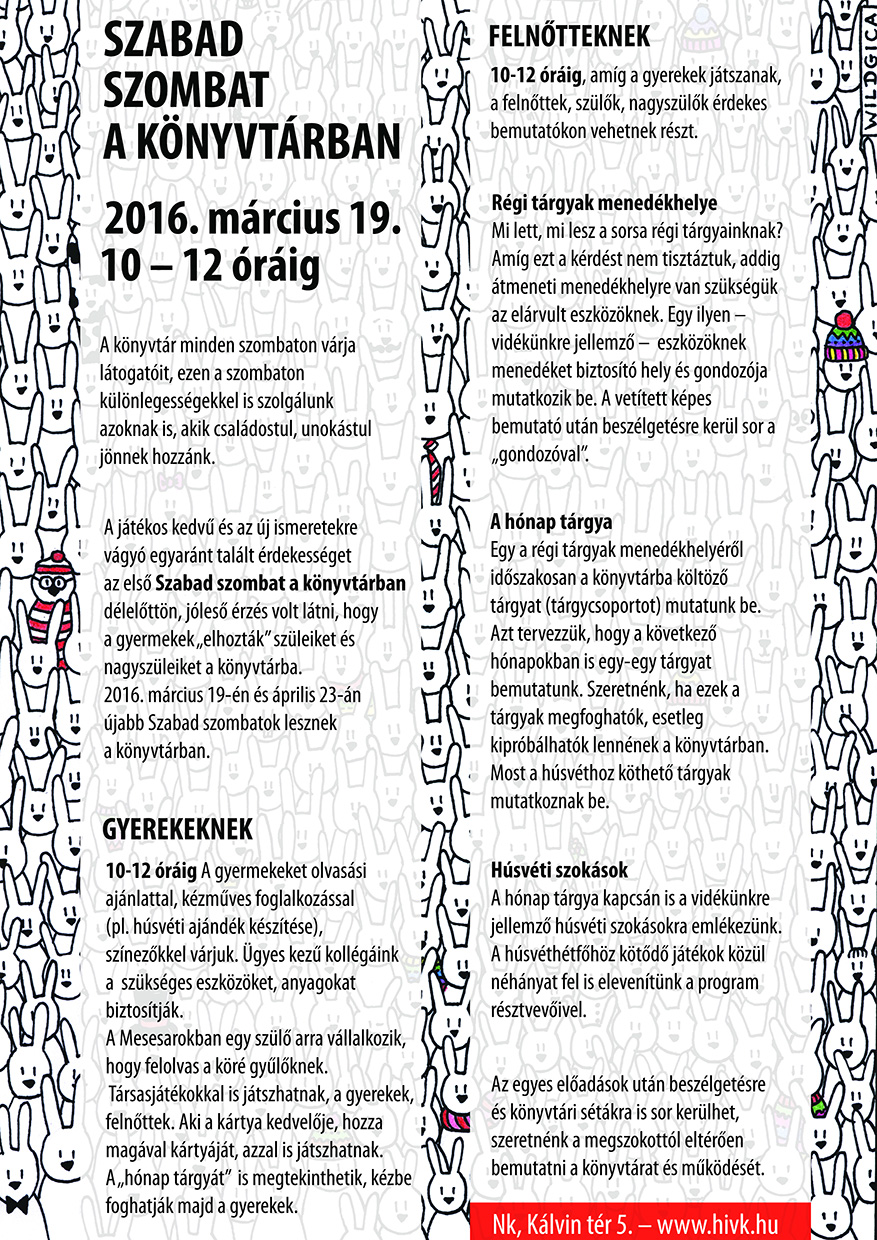 Nyilvános 1138 | 2334 | Rövid leírás | Teljes leírás (2.93 KB) | SZABAD SZOMBAT A KÖNYVTÁRBAN 2016. március 19. 10 – 12 óráig A könyvtár minden szombaton várja látogatóit, ezen a szombaton különlegességekkel is szolgálunk azoknak is, akik családostul, unokástul jönnek hozzánk. A játékos kedvű és az új ismeretekre vágyó egyaránt talált érdekességet az első Szabad szombat a könyvtárban délelőttön, jóleső érzés volt látni, hogy a gyermekek „elhozták” szüleiket és nagyszüleiket a könyvtárba. 2016. március 19-én és április 23-án újabb Szabad szombatok lesznek a könyvtárban. GYEREKEKNEK 10-12 óráig A gyermekeket olvasási ajánlattal, kézműves foglalkozással (pl. húsvéti ajándék készítése), színezőkkel várjuk. Ügyes kezű kollégáink a szükséges eszközöket, anyagokat biztosítják. A Mesesarokban egy szülő arra vállalkozik, hogy felolvas a köré gyűlőknek. Társasjátékokkal is játszhatnak, a gyerekek, felnőttek. Aki a kártya kedvelője, hozza magával kártyáját, azzal is játszhatnak. A „hónap tárgyát” is megtekinthetik, kézbe foghatják majd a gyerekek. FELNŐTTEKNEK 10-12 óráig, amíg a gyerekek játszanak, a felnőttek, szülők, nagyszülők érdekes bemutatókon vehetnek részt. Régi tárgyak menedékhelye Mi lett, mi lesz a sorsa régi tárgyainknak? Amíg ezt a kérdést nem tisztáztuk, addig átmeneti menedékhelyre van szükségük az elárvult eszközöknek. Egy ilyen – vidékünkre jellemző – eszközöknek menedéket biztosító hely és gondozója mutatkozik be. A vetített képes bemutató után beszélgetésre kerül sor a „gondozóval”. A hónap tárgya Egy a régi tárgyak menedékhelyéről időszakosan a könyvtárba költöző tárgyat (tárgycsoportot) mutatunk be. Azt tervezzük, hogy a következő hónapokban is egy-egy tárgyat bemutatunk. Szeretnénk, ha ezek a tárgyak megfoghatók, esetleg kipróbálhatók lennének a könyvtárban. Most a húsvéthoz köthető tárgyak mutatkoznak be. Húsvéti szokások A hónap tárgya kapcsán is a vidékünkre jellemző húsvéti szokásokra emlékezünk. A húsvéthétfőhöz kötődő játékok közül néhányat fel is elevenítünk a program résztvevőivel. Az egyes előadások után beszélgetésre és könyvtári sétákra is sor kerülhet, szeretnénk a megszokottól eltérően bemutatni a könyvtárat és működését. Nk, Kálvin tér 5. – www.hivk.hu |