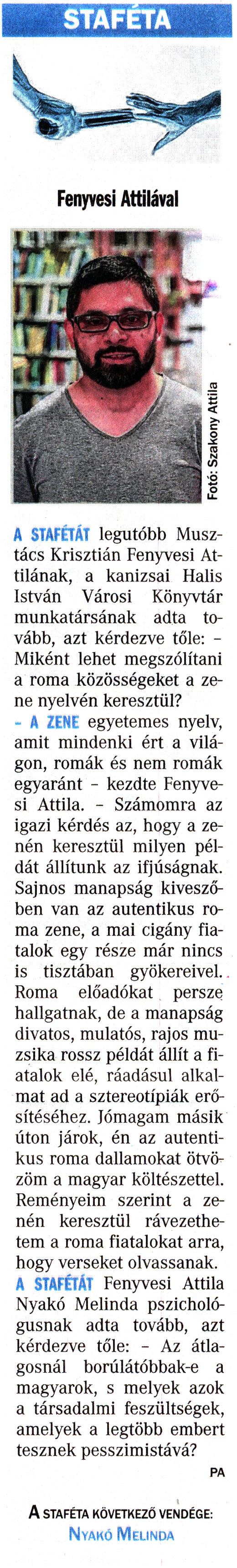 Nyilvános 2245 | 5675 | Vasárnapi Zalai Hírlap 2017. június 3. 22. szám 5. oldal | STAFÉTA Fenyvesi Attilával A STAFÉTÁT legutóbb Musztács Krisztián Fenyvesi Attilának, a kanizsai Halis István Városi Könyvtár munkatársának adta tovább, azt kérdezve tőle: - Miként lehet megszólítani a roma közösségeket a zene nyelvén keresztül? - A ZENE egyetemes nyelv, amit mindenki ért a világon, romák és nem romák egyaránt - kezdte Fenyvesi Attila. - Számomra az igazi kérdés az, hogy a zenén keresztül milyen példát állítunk az ifjúságnak. Sajnos manapság kiveszőben van az autentikus roma zene, a mai cigány fiatalok egy része már nincs is tisztában gyökereivel. Roma előadókat persze hallgatnak, de a manapság divatos, mulatós, rajos muzsika rossz példát állít a fiatalok elé, ráadásul alkalmat ad a sztereotípiák erősítéséhez. Jómagam másik úton járok, én az autentikus roma dallamokat ötvözöm a magyar költészettel. Reményeim szerint a zenén keresztül rávezethetem a roma fiatalokat arra, hogy verseket olvassanak. A STAFÉTÁT Fenyvesi Attila Nyakó Melinda pszichológusnak adta tovább, azt kérdezve tőle: - Az átlagosnál borúlátóbbak-e a magyarok, s melyek azok a társadalmi feszültségek, amelyek a legtöbb embert tesznek pesszimistává? PA A STAFÉTA KÖVETKEZŐ VENDÉGE: Nyakó Melinda |