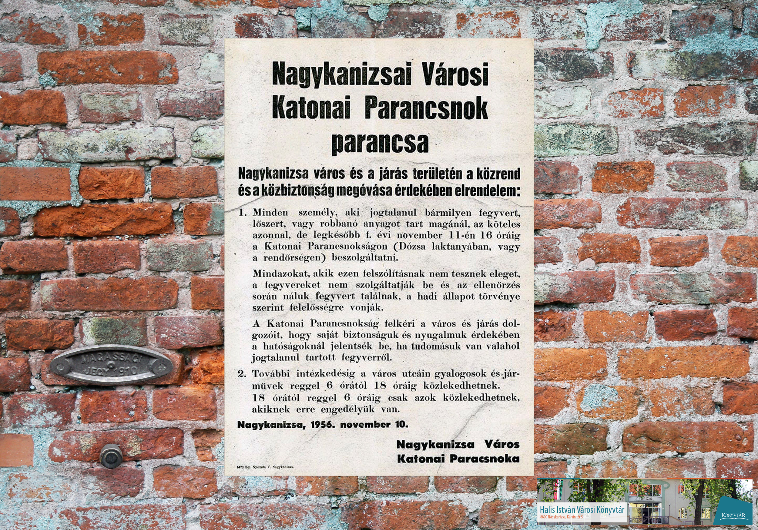 Nyilvános 1186 | 1968 | Az 1956-os forradalom leverése után | Október 23-i kiállításunk képei közül az időrendben következőt mutatjuk be. Az előző két szórólap a forradalmi szervek dokumentuma volt. Most egy falragasz következik, ez azonban már a forradalom leverése után készült. A szovjet csapatok 1956. november 5-én szállták meg Nagykanizsát, november 7-én el is hagyták a várost. A helyi katonai parancsnok ezek után tett közzé ezt az utasítását. Kattintson a képre! |