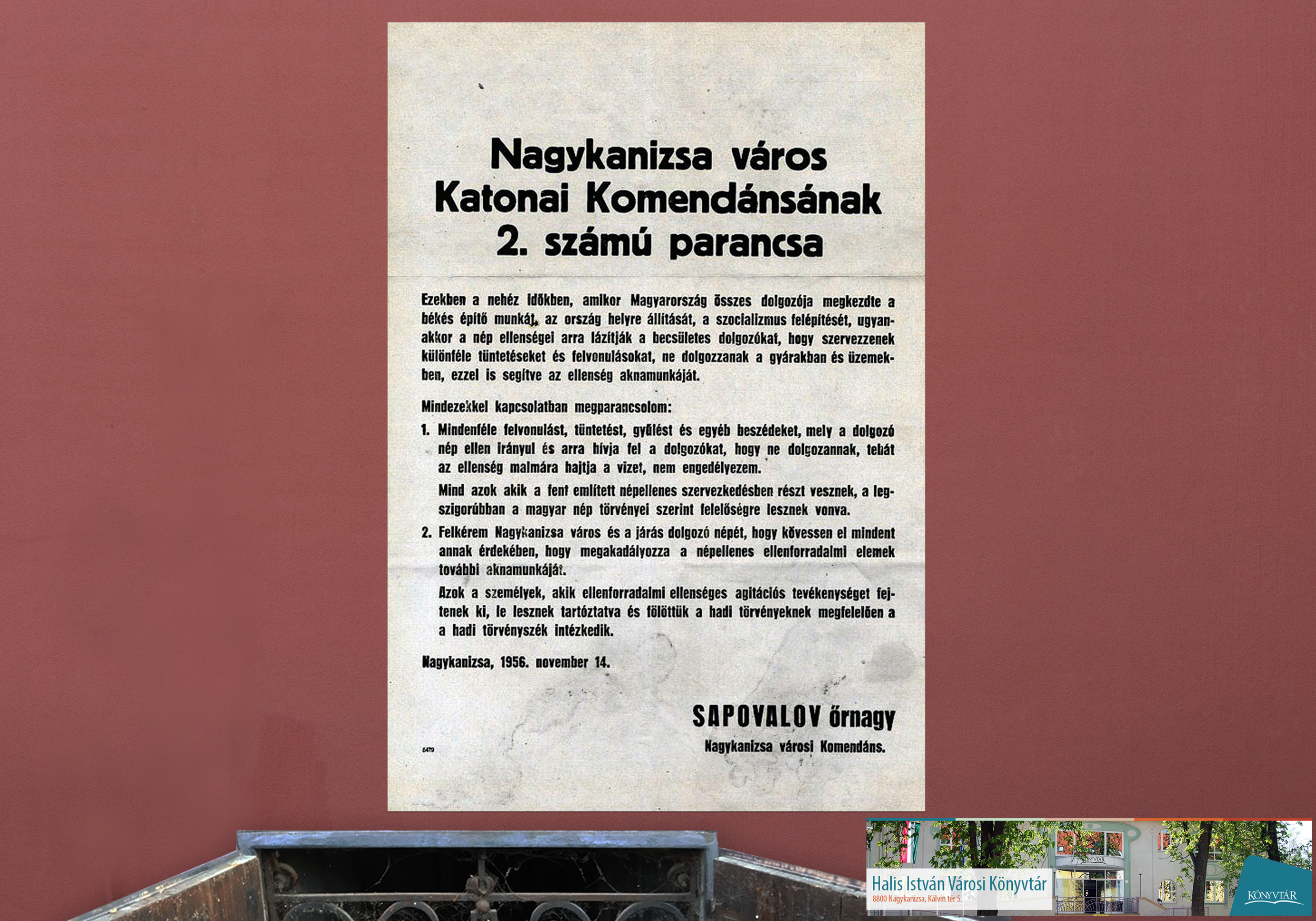 Nyilvános 2239 | 2646 | Egy kiállítás utolsó képe | Az 1956. november 14-én megjelent plakát megmutatása a zárása az október 23-a tiszteletére készült kiállításunknak. Az utolsó dokumentum már a későbbi időszakból ismert ellenségképet rajzolja fel. Tíz nappal a forradalom leverése után hadi állapotnak megfelelő eljárással fenyeget a megszálló hadsereg képviselője. Itt köszönünk el a korabeli történésektől és ezekkel a gondolatokkal a könyvtári emlékező kiállítástól. |