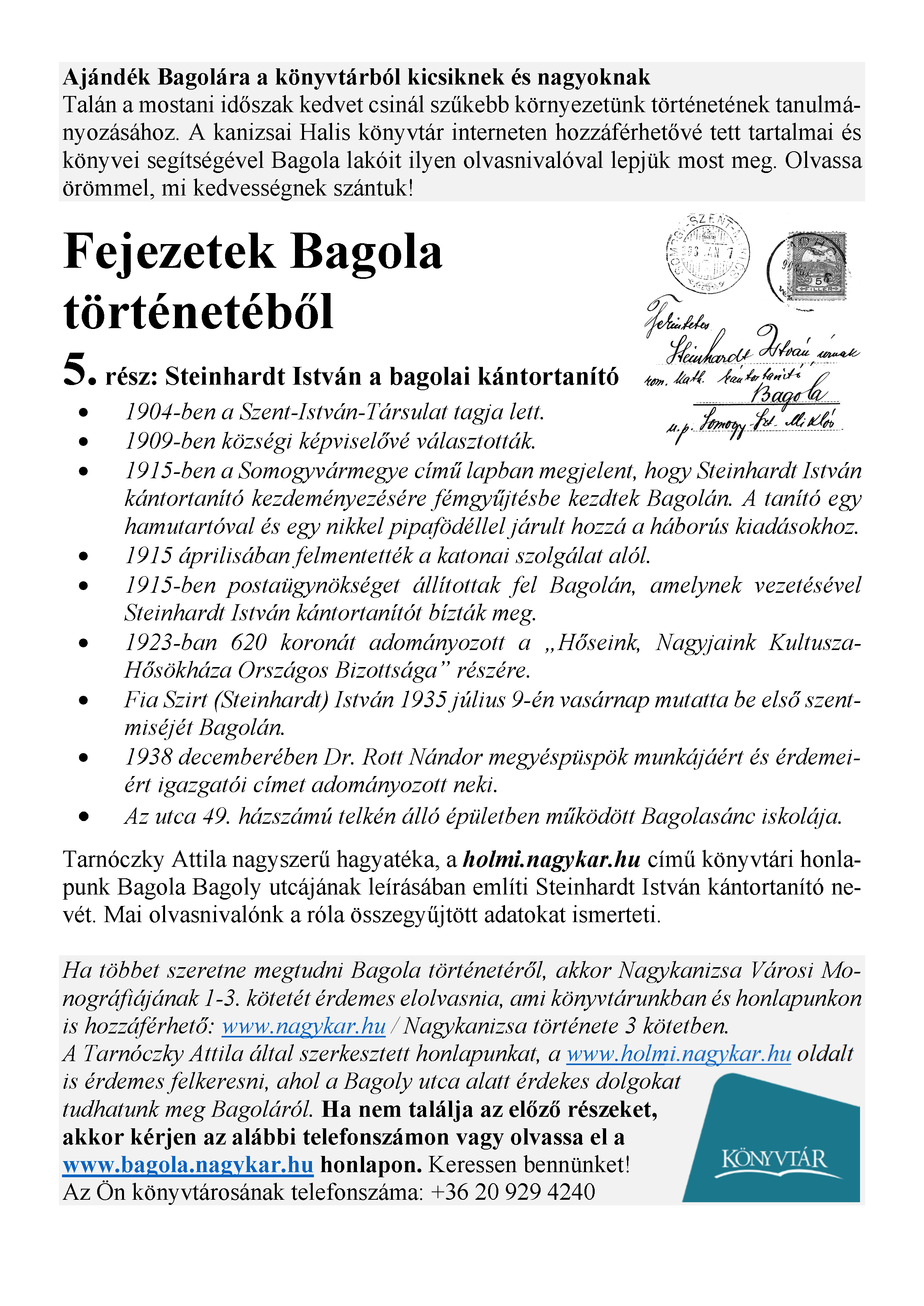 Nyilvános 2078 | 3396 | Megjelenés: 2021. május 21. | Ajándék Bagolára a könyvtárból kicsiknek és nagyoknak Talán a mostani időszak kedvet csinál szűkebb környezetünk történetének tanulmányozásához. A kanizsai Halis könyvtár interneten hozzáférhetővé tett tartalmai és könyvei segítségével Bagola lakóit ilyen olvasnivalóval lepjük most meg. Olvassa örömmel, mi kedvességnek szántuk! Fejezetek Bagola történetéből 5. rész: Steinhardt István a bagolai kántortanító • 1904-ben a Szent-István-Társulat tagja lett. • 1909-ben községi képviselővé választották. • 1915-ben a Somogyvármegye című lapban megjelent, hogy Steinhardt István kántortanító kezdeményezésére fémgyűjtésbe kezdtek Bagolán. A tanító egy hamutartóval és egy nikkel pipafödéllel járult hozzá a háborús kiadásokhoz. • 1915 áprilisában felmentették a katonai szolgálat alól. • 1915-ben postaügynökséget állítottak fel Bagolán, amelynek vezetésével Steinhardt István kántortanítót bízták meg. • 1923-ban 620 koronát adományozott a „Hőseink, Nagyjaink Kultusza-Hősökháza Országos Bizottsága” részére. • Fia Szirt (Steinhardt) István 1935 július 9-én vasárnap mutatta be első szentmiséjét Bagolán. • 1938 decemberében Dr. Rott Nándor megyéspüspök munkájáért és érdemeiért igazgatói címet adományozott neki. • Az utca 49. házszámú telkén álló épületben működött Bagolasánc iskolája. Tarnóczky Attila nagyszerű hagyatéka, a holmi.nagykar.hu című könyvtári honlapunk Bagola Bagoly utcájának leírásában említi Steinhardt István kántortanító nevét. Mai olvasnivalónk a róla összegyűjtött adatokat ismerteti. Ha többet szeretne megtudni Bagola történetéről, akkor Nagykanizsa Városi Monográfiájának 1-3. kötetét érdemes elolvasnia, ami könyvtárunkban és honlapunkon is hozzáférhető: www.nagykar.hu / Nagykanizsa története 3 kötetben. A Tarnóczky Attila által szerkesztett honlapunkat, a www.holmi.nagykar.hu oldalt is érdemes felkeresni, ahol a Bagoly utca alatt érdekes dolgokat tudhatunk meg Bagoláról. Ha nem találja az előző részeket, akkor kérjen az alábbi telefonszámon vagy olvassa el a www.bagola.nagykar.hu honlapon. Keressen bennünket! Az Ön könyvtárosának telefonszáma: +36 20 929 4240 |