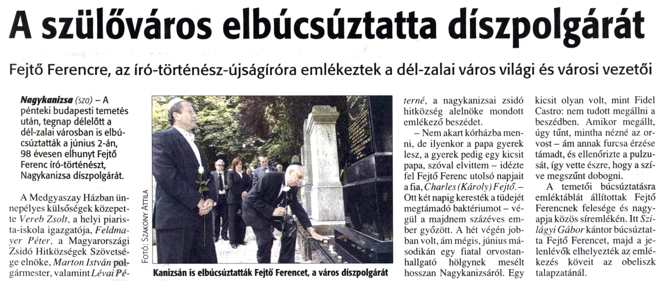Nyilvános 906 | 1228 | Zalai Hírlap 2008. június 16. 3. oldal | A szülőváros elbúcsúztatta díszpolgárát Fejtő Ferencre, az író-történész-újságíróra emlékeztek a dél-zalai város világi és városi vezetői Nagykanizsa (sza) - A pénteki budapesti temetés után, tegnap délelőtt a dél-zalai városban is elbúcsúztatták a június 2-án, 98 évesen elhunyt Fejtő Ferenc író-történészt, Nagykanizsa díszpolgárát. A Medgyaszay Házban ünnepélyes külsőségek közepette Vereb Zsolt, a helyi piarista-iskola igazgatója, Feldmayer Péter, a Magyarországi Zsidó Hitközségek Szövetsége elnöke, Marton István polgármester, valamint Lévai Pétérné, a nagykanizsai zsidó hitközség alelnöke mondott emlékező beszédet. - Nem akart kórházba menni, de ilyenkor a papa gyerek lesz, a gyerek pedig egy kicsit papa, szóval elvittem - idézte fel Fejtő Ferenc utolsó napjait a fia, Charles (Károly) Fejtő. - Ott két napig keresték a tüdejét megtámadó baktériumot - végül a majdnem százéves ember győzött. A hét végén jobban volt, ám mégis, június másodikén egy fiatal orvostanhallgató hölgynek mesélt hosszan Nagykanizsáról. Egy kicsit olyan volt, mint Fidel Castro: nem tudott megállni a beszédben. Amikor megállt, úgy tűnt, mintha nézné az orvost - ám annak furcsa érzése támadt, és ellenőrizte a pulzusát, így vette észre, hogy a szíve megszűnt dobogni. A temetői búcsúztatásra emléktáblát állítottak Fejtő Ferencnek felesége és nagyapja közös síremlékén. Itt Szilágyi Gábor kántor búcsúztatta Fejtő Ferencet, majd a jelenlévők elhelyezték az emlékezés köveit az obeliszk talapzatánál. Kanizsán is elbúcsúztatták Fejtő Ferencet, a város díszpolgárát |