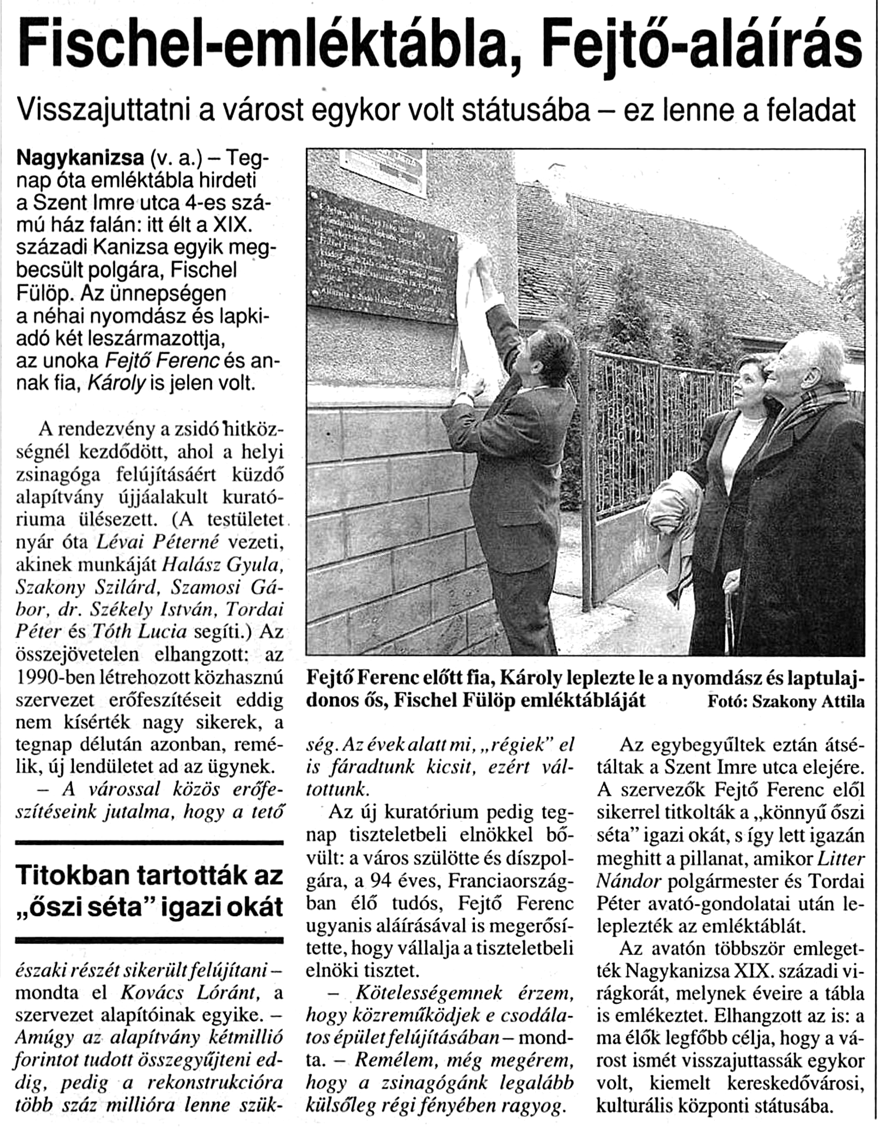 Nyilvános 1355 | 1815 | Zalai Hirlap 2003. október 14. 5. oldal | Fischel-emléktábla, Fejtő-aláírás Visszajuttatni a várost egykor volt státusába - ez lenne a feladat Nagykanizsa (v. a.) - Tegnap óta emléktábla hirdeti a Szent Imre utca 4-es számú ház falán: itt élt a XIX. századi Kanizsa egyik megbecsült polgára, Fischel Fülöp. Az ünnepségen a néhai nyomdász és lapkiadó két leszármazottja, az unoka Fejtő Ferenc és annak fia, Károly is jelen volt. A rendezvény a zsidó hitközségnél kezdődött, ahol a helyi zsinagóga felújításáért küzdő alapítvány újjáalakult kuratóriuma ülésezett. (A testületet nyár óta Lévai Péterné vezeti, akinek munkáját Halász Gyula, Szakony Szilárd, Szamosi Gábor, dr. Székely István, Tordai Péter és Tóth Lucia segíti.) Az összejövetelen elhangzott: az 1990-ben létrehozott közhasznú szervezet erőfeszítéseit eddig nem kísérték nagy sikerek, a tegnap délután azonban, remélik, új lendületet ad az ügynek. - A várossal közös erőfeszítéseink jutalma, hogy a tető északi részét sikerült felújítani - mondta el Kovács Lóránt, a szervezet alapítóinak egyike. - Amúgy az alapítvány kétmillió forintot tudott összegyűjteni eddig, pedig a rekonstrukcióra több száz millióra lenne szükség. Az évek alatt mi, „régiek” el is fáradtunk kicsit, ezért váltottunk. Az új kuratórium pedig tegnap tiszteletbeli elnökkel bővült: a város szülötte és díszpolgára, a 94 éves, Franciaországban élő tudós, Fejtő Ferenc ugyanis aláírásával is megerősítette, hogy vállalja a tiszteletbeli elnöki tisztet. - Kötelességemnek érzem, hogy közreműködjek e csodálatos épület felújításában - mondta. - Remélem, még megérem, hogy a zsinagógánk legalább külsőleg régi fényében ragyog. Az egybegyűltek eztán átsétáltak a Szent Imre utca elejére. A szervezők Fejtő Ferenc elől sikerrel titkolták a„könnyű őszi séta” igazi okát, s így lett igazán meghitt a pillanat, amikor Litter Nándor polgármester és Tordai Péter avató-gondolatai után leleplezték az emléktáblát. Az avatón többször emlegették Nagykanizsa XIX. századi virágkorát, melynek éveire a tábla is emlékeztet. Elhangzott az is: a ma élők legfőbb célja, hogy a várost ismét visszajuttassák egykor volt, kiemelt kereskedővárosi, kulturális központi státusába. Fejtő Ferenc előtt fia, Károly leplezte le a nyomdász és laptulajdonos ős, Fischel Fülöp emléktábláját Fotó: Szakony Attila |