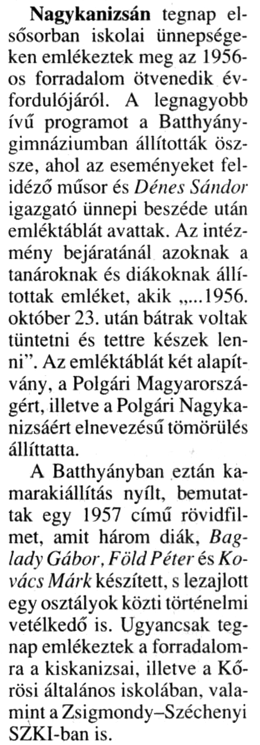 Nyilvános 1289 | 1637 | Zalai Hírlap 2006. október 21. 3. oldal - A legtisztább forradalom - Nagykanizsa | Nagykanizsán tegnap elsősorban iskolai ünnepségeken emlékeztek meg az 1956-os forradalom ötvenedik évfordulójáról. A legnagyobb ívű programot a Batthyány-gimnáziumban állították össze, ahol az eseményeket felidéző műsor és Dénes Sándor igazgató ünnepi beszéde után emléktáblát avattak. Az intézmény bejáratánál azoknak a tanároknak és diákoknak állítottak emléket, akik „...1956. október 23. után bátrak voltak tüntetni és tettre készek lenni". Az emléktáblát két alapítvány, a Polgári Magyarországért, illetve a Polgári Nagykanizsáért elnevezésű tömörülés állíttatta. A Batthyányban eztán kamarakiállítás nyílt, bemutattak egy 1957 című rövidfilmet, amit három diák. Baglady Gábor, Föld Péter és Kovács Márk készített, s lezajlott egy osztályok közti történelmi vetélkedő is. Ugyancsak tegnap emlékeztek a forradalomra a kiskanizsai, illetve a Körösi általános iskolában, valamint a Zsigmondy-Széchenyi SZKI-ban is. |