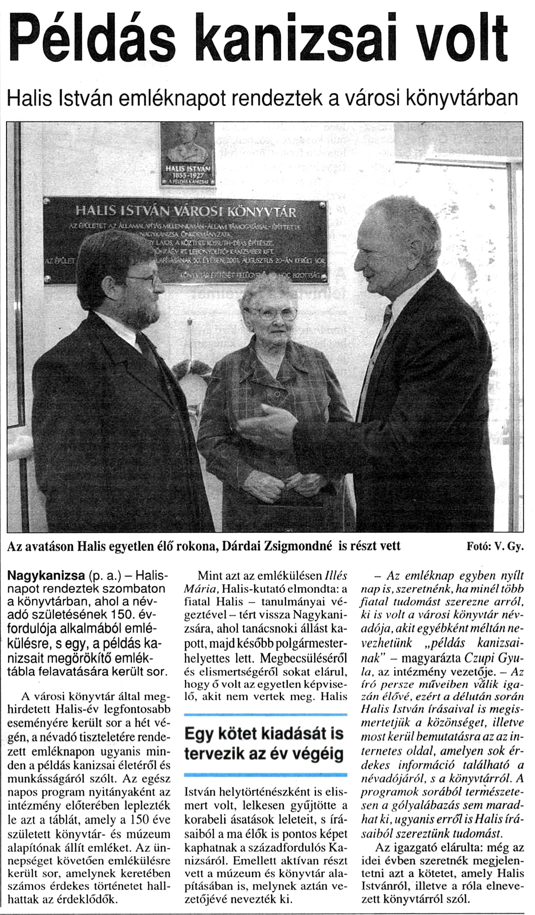 Nyilvános 992 | 1404 | Zalai Hírlap 2005. szeptember 26. 5. oldal | Példás kanizsai volt Halis István emléknapot rendeztek a városi könyvtárban Az avatáson Halis egyetlen élő rokona, Dárdai Zsigmondné is részt vett Fotó: V. Gy. Nagykanizsa (p. a.) - Halis-napot rendeztek szombaton a könyvtárban, ahol a névadó születésének 150. évfordulója alkalmából emlékülésre, s egy, a példás kanizsait megörökítő emléktábla felavatására került sor. A városi könyvtár által meghirdetett Halis-év legfontosabb eseményére került sor a hét végén, a névadó tiszteletére rendezett emléknapon ugyanis minden a példás kanizsai életéről és munkásságáról szólt. Az egész napos program nyitányaként az intézmény előterében leplezték le azt a táblát, amely a 150 éve születeti könyvtár- és múzeum alapítónak állít emléket. Az ünnepséget követően emlékülésre került sor, amelynek keretében számos érdekes történetet hallhattak az érdeklődők. Mint azt az emlékülésen Illés Mária. Halis-kutató elmondta: a fiatal Halis - tanulmányai végeztével - tért vissza Nagykanizsára, ahol tanácsnoki állást kapott, majd később polgármester-helyettes lett. Megbecsüléséről és elismertségéről sokat elárul, hogy ő volt az egyetlen képviselő, akit nem vertek meg. Halis István helytörténészként is elismert volt, lelkesen gyűjtötte a korabeli ásatások leleteit, s írásaiból a ma élők is pontos képet kaphatnak a századfordulós Kanizsáról. Emellett aktívan részt vett a múzeum és könyvtár alapításában is, melynek aztán vezetőjévé nevezték ki. - Az emléknap egyben nyílt nap is, szeretnénk, ha minél több fiatal tudomást szerezne arról, ki is volt a városi könyvtár névadója, akit egyébként méltán nevezhetünk „példás kanizsainak" - magyarázta Czupi Gyula, az intézmény vezetője. - Az író persze műveiben válik igazán élővé, ezért a délután során Halis István írásaival is megismertetjük a közönséget, illetve most kerül bemutatásra az az internetes oldal, amelyen sok érdekes információ található a névadójáról, s a könyvtárról. A programok sorából természetesen a gólyalábazás sem maradhat ki, ugyanis erről is Halis írásaiból szereztünk tudomást. Az igazgató elárulta: még az idei évben szeretnék megjelentetni azt a kötetei, amely Halis Istvánról, illetve a róla elnevezett könyvtárról szól. |